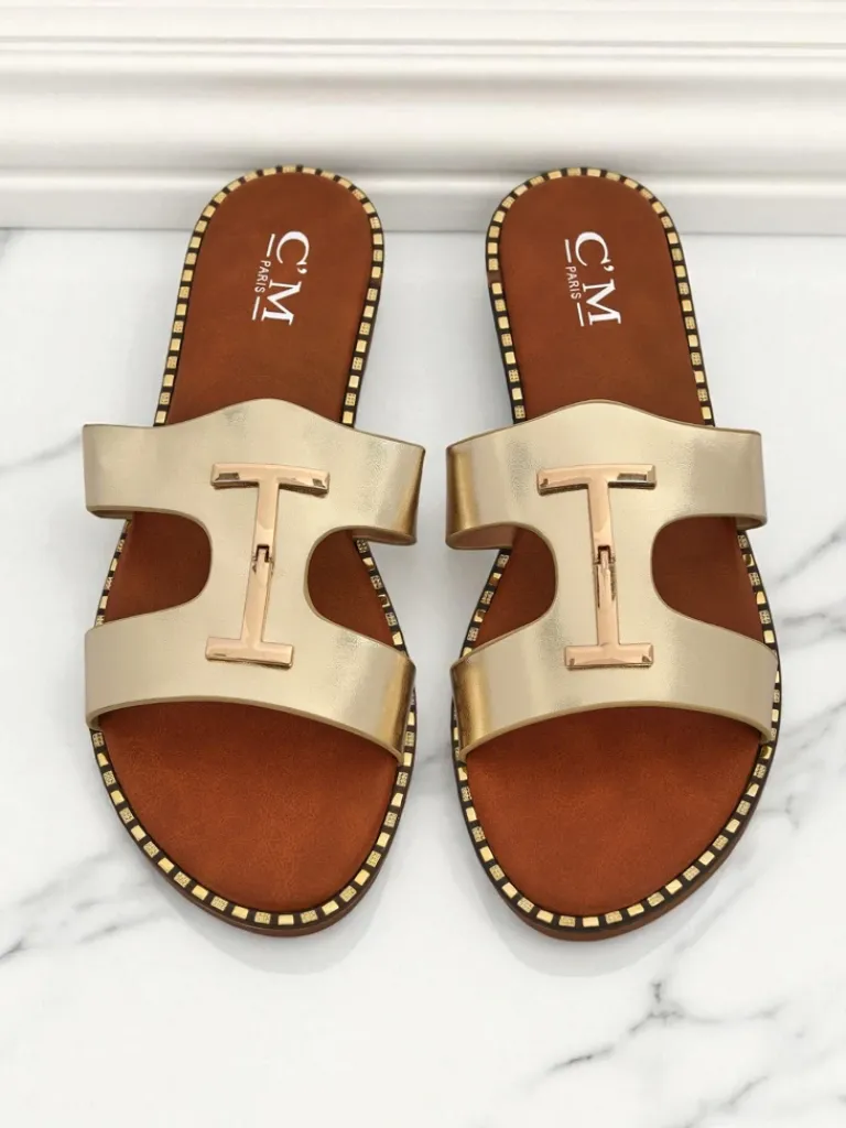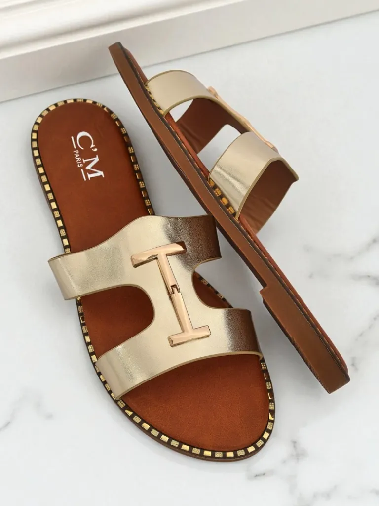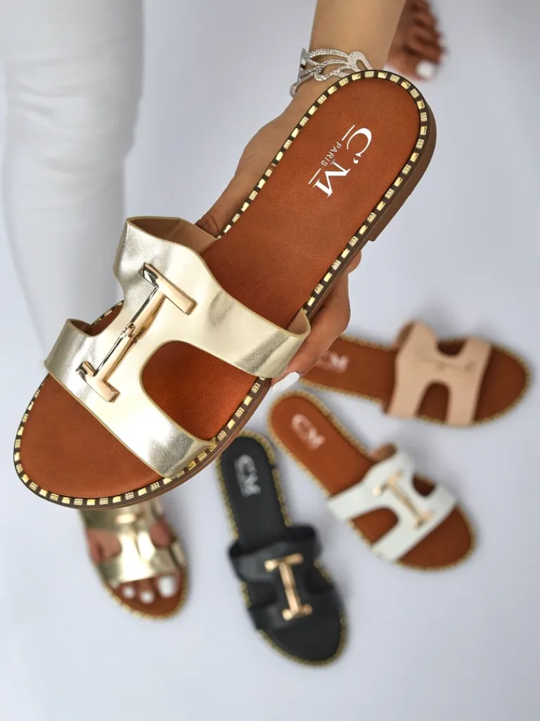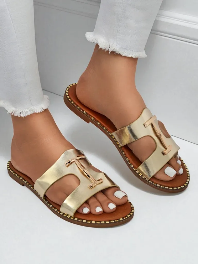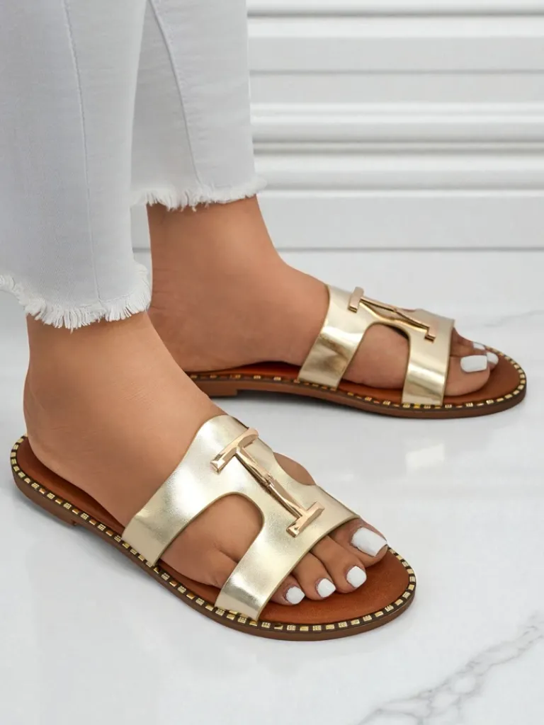 - Damskie klapki z eko skóry na płaskiej podeszwie z modnym pleceniem i złotą ozdobą. Stylowe i wygodne, idealne na lato. Lekka konstrukcja oraz elegancki akcent dodają szyku każdej codziennej stylizacji.