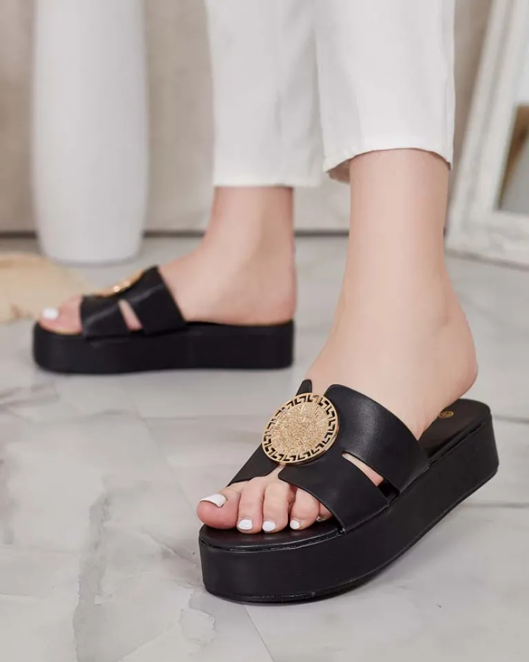 - Klapki damskie wykonane z eko skóry. Platforma i ozdoby na paseczkach dodają uroku i charakteru. Ciesz się wygodą i stylem zabierając te obuwie na wakacje!