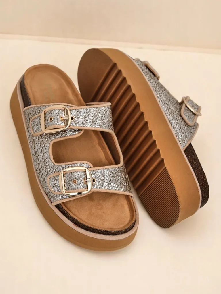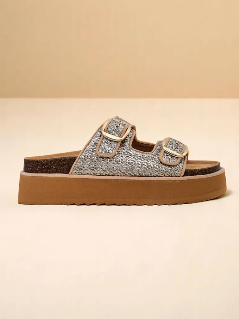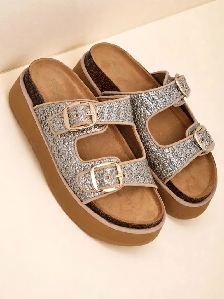 - Płaskie klapki na platformie z eko skóry w pleciony wzór. Stylowe klamerki i modna faktura dodają charakteru. Idealne na lato – wygodne, lekkie i na czasie.