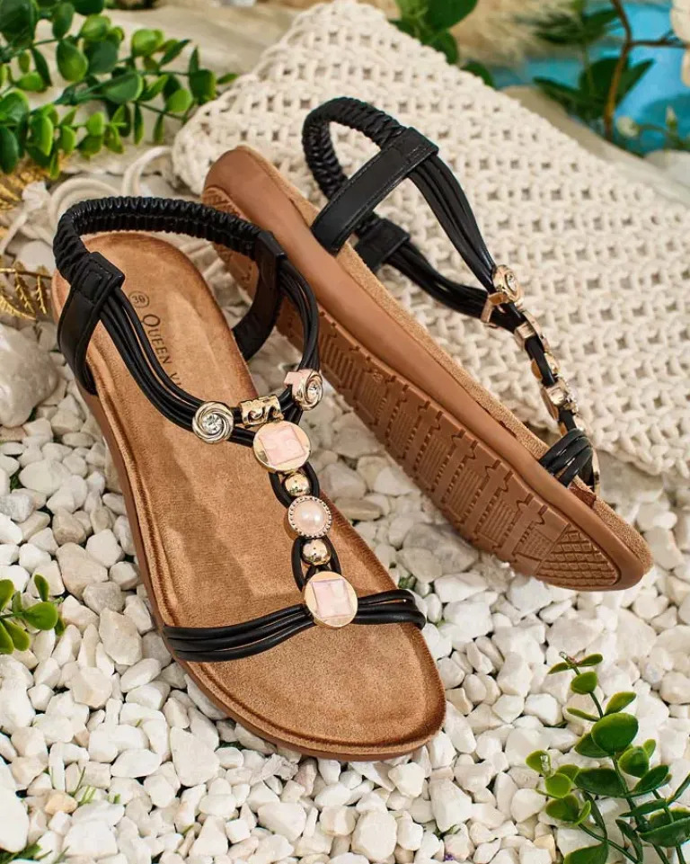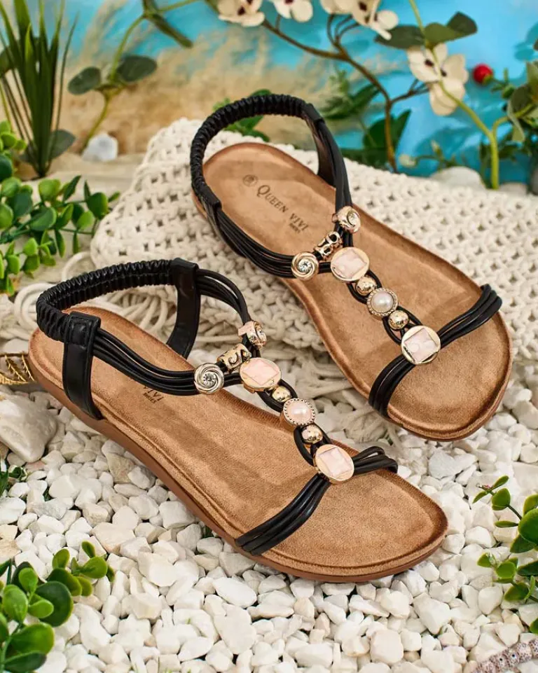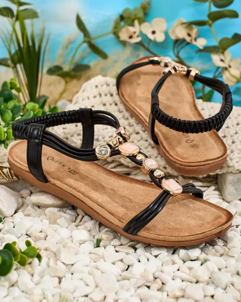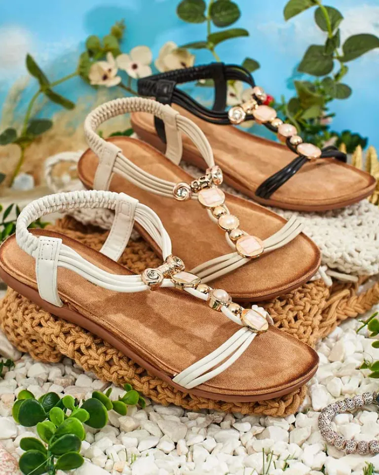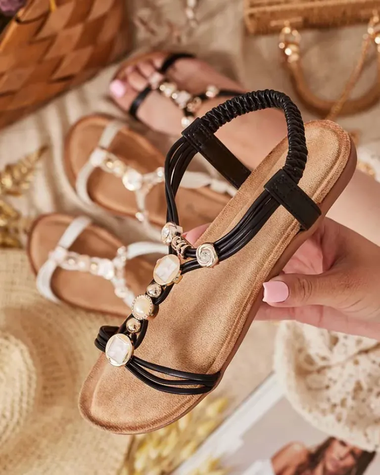 - Damskie sandałki na płaskiej podeszwie – to idealny pomysł na gorące letnie dni. Paseczki wykonane ze skóry ekologicznej, zaś wkładka to skóra ekologiczna matowa. Model udekorowany ozdobnymi dżetami.
