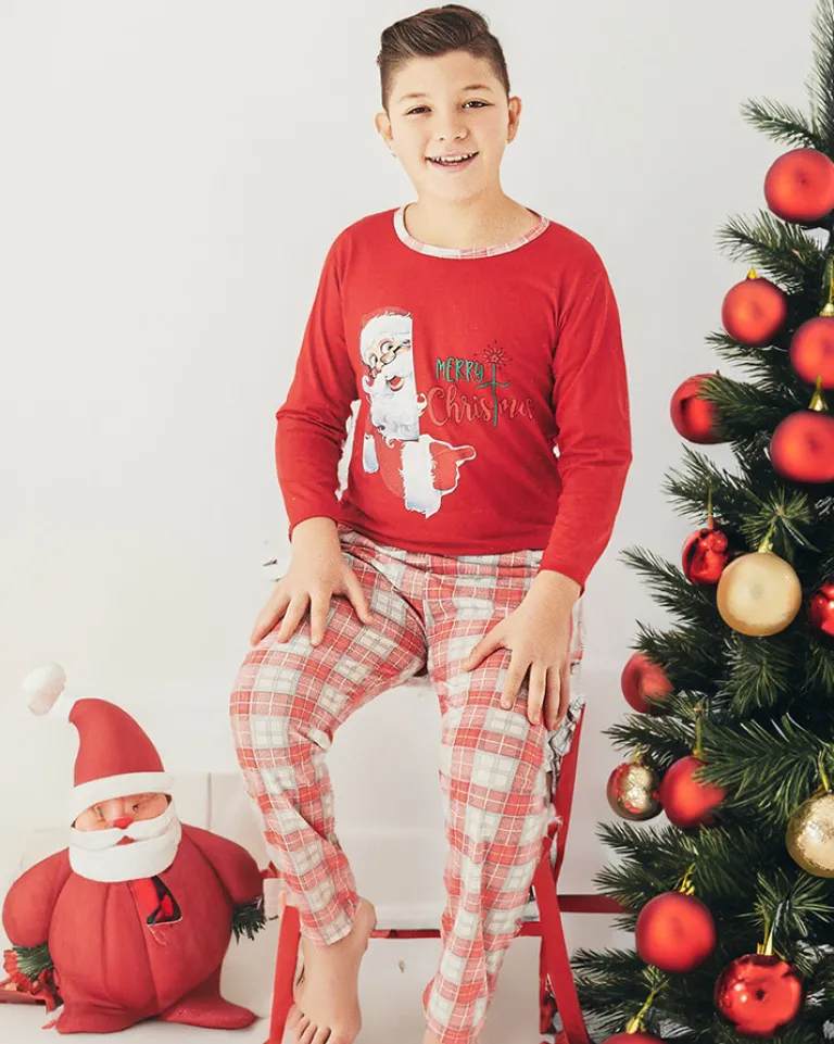 - Dwuczęściowa dziecięca piżama w kolorze czerwonym, wykonana ze miękkiej bawełny. Model zdobiony świątecznym printem, spodnie w kratkę, bluzka z Mikołajem. Ten model to idealny prezent na święta!