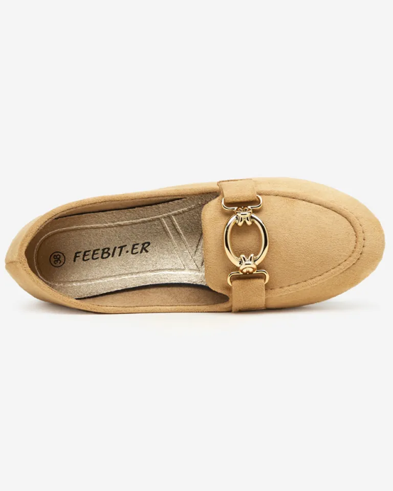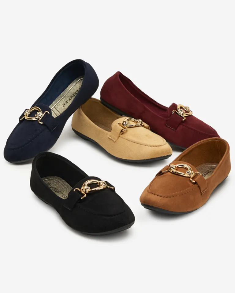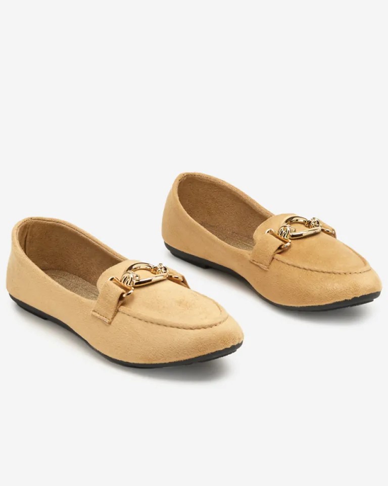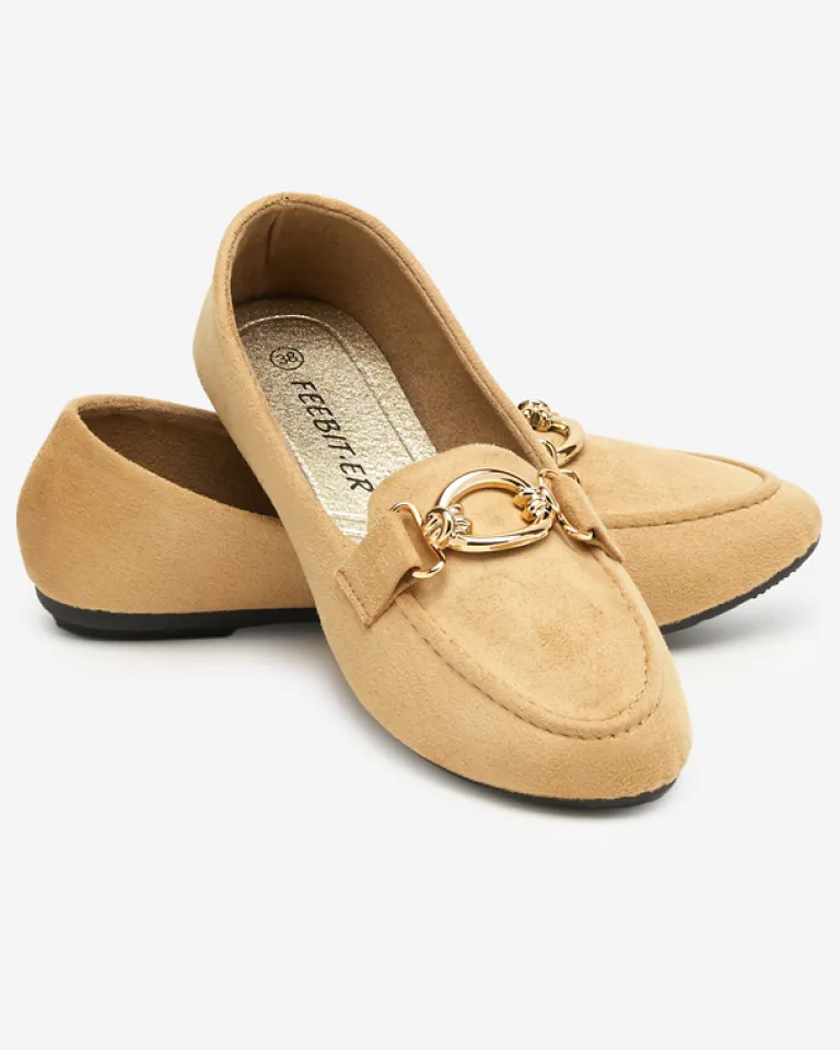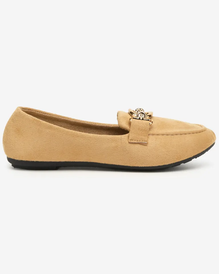 - Klasyczne damskie mokasyny z metalową ozdobą na nosku. Cholewka wykonana ze skóry ekologicznej zamszowej. Miękka wkładka jest wykonana z tkaniny. Doskonale sprawdzą się na wąską stopę.