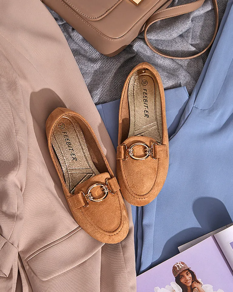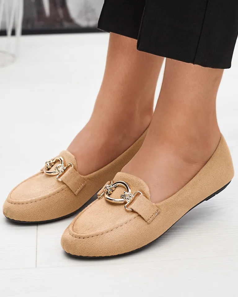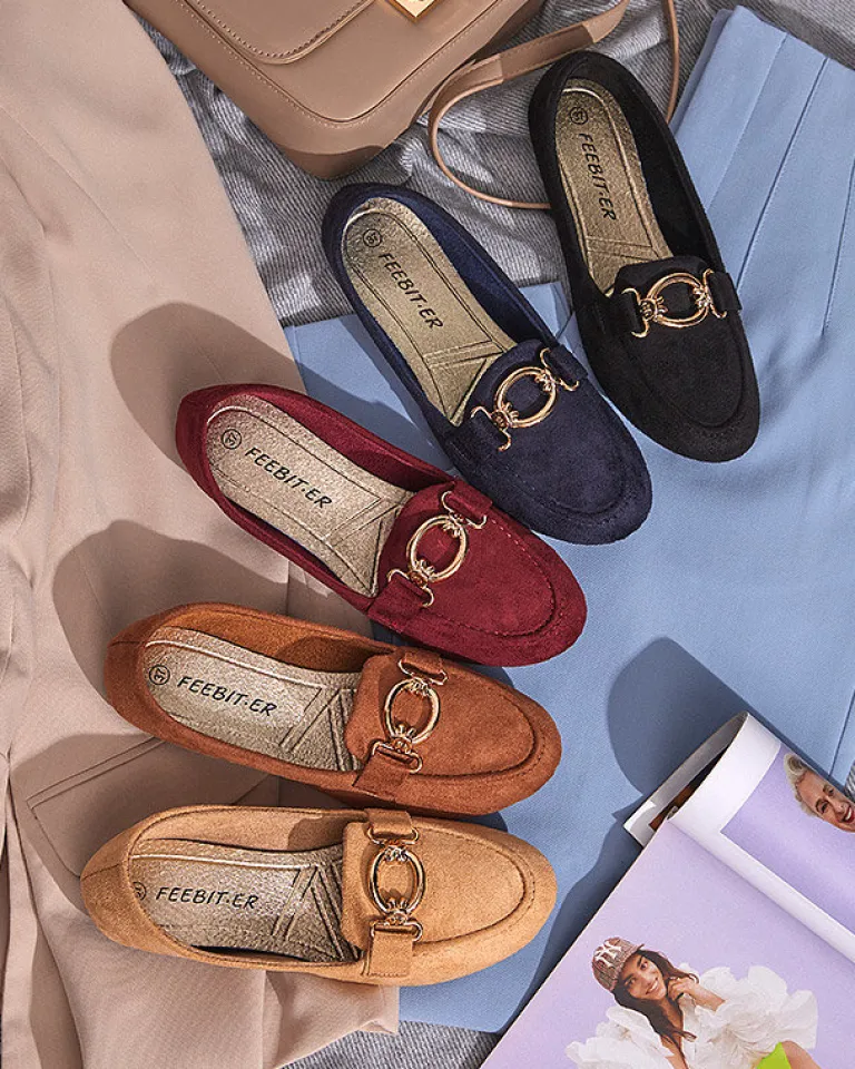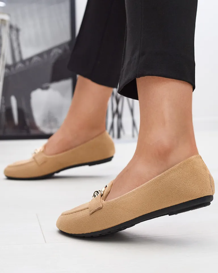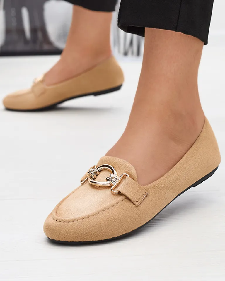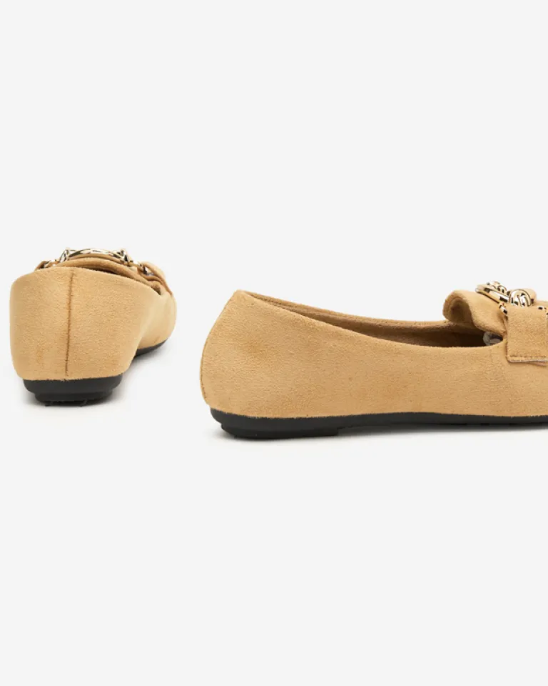 - Klasyczne damskie mokasyny z metalową ozdobą na nosku. Cholewka wykonana ze skóry ekologicznej zamszowej. Miękka wkładka jest wykonana z tkaniny. Doskonale sprawdzą się na wąską stopę.