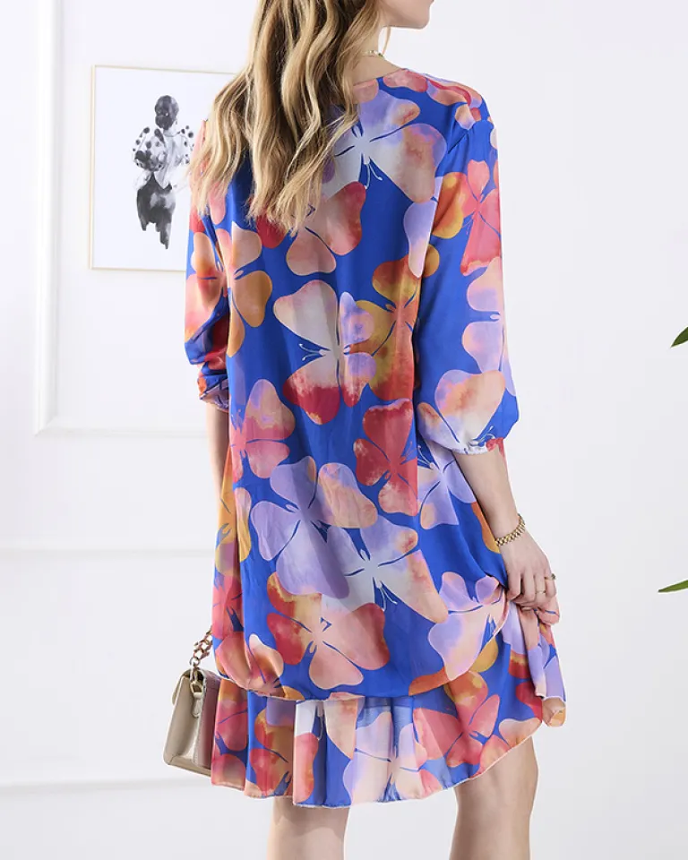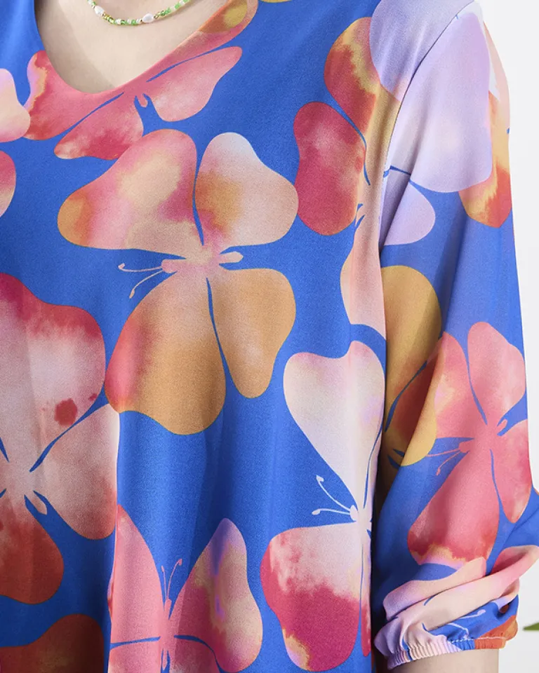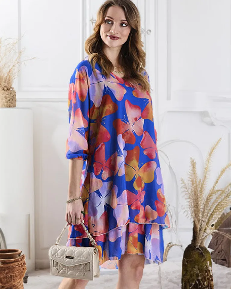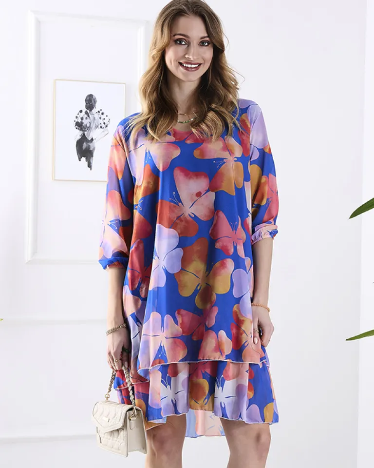 - Stylowa sukienka o luźnym kroju oversize, z rękawami 3/4 zakończonym gumką. Materiał wykonania – poliester. Sukienka posiada dekolt w serek i jest zakończona falbanką. Model do kolan, zdobiony printem. UWAGA: Dokładność pomiaru (+/-) 1 cm.