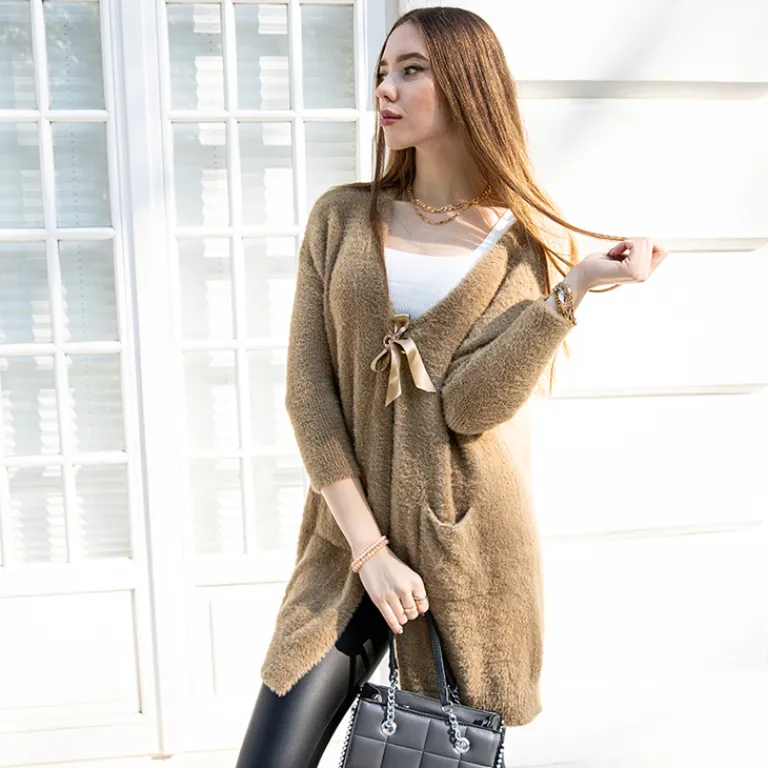 - Miękki damski długi sweter typu narzutka, wykonany z materiału a’la futerko. Kardigan jest wiązany wstążką, po bokach dwie wsuwane kieszenie. Idealny element Twojej garderoby na chłodniejsze dni. UWAGA: Dokładność pomiaru (+/-) 1 cm.