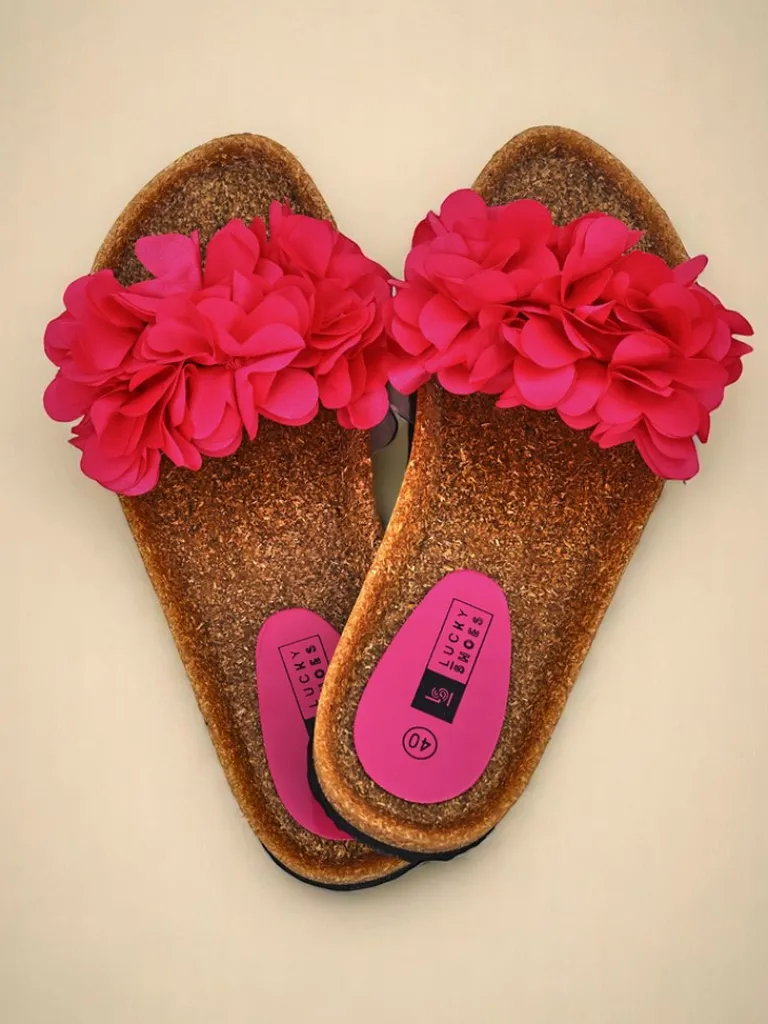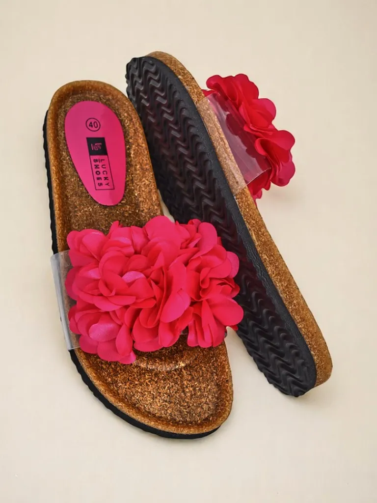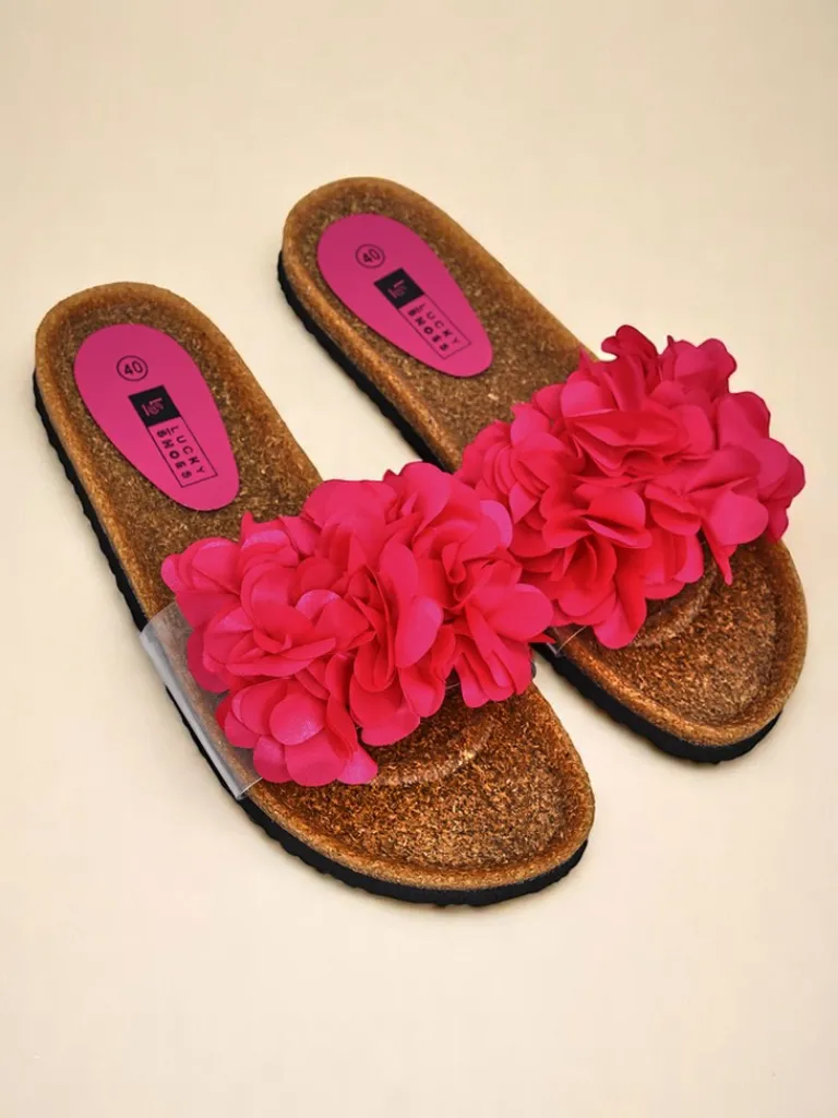 - Urocze klapki z płaską, gumową podeszwą i ozdobnymi kwiatuszkami na paseczku. Idealne na lato – lekkie, wygodne i kobiece. Dodadzą uroku każdej stylizacji.