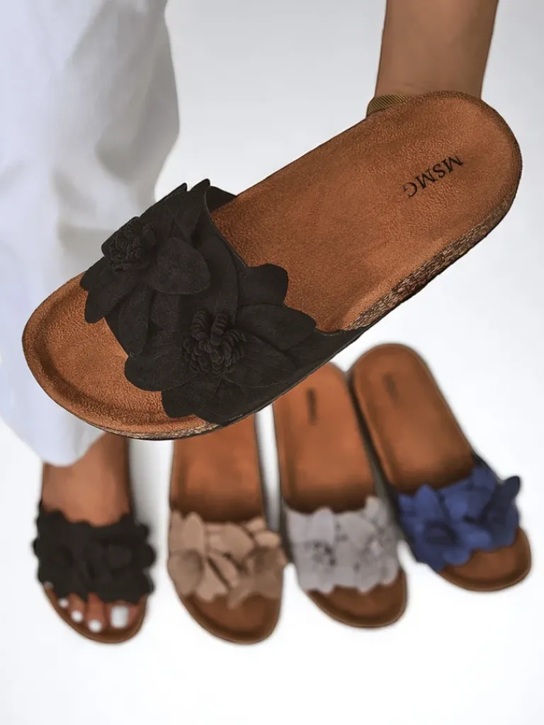 - Przepiękne klapki damskie wykonane ze skóry ekologicznej zamszowej, zdobione kwiatuszkami. Gumowa podeszwa zdobiona materiałem a’la korek. Model w ciekawej kolorystyce. Idealnie uzupełnią letnie stylizacje!