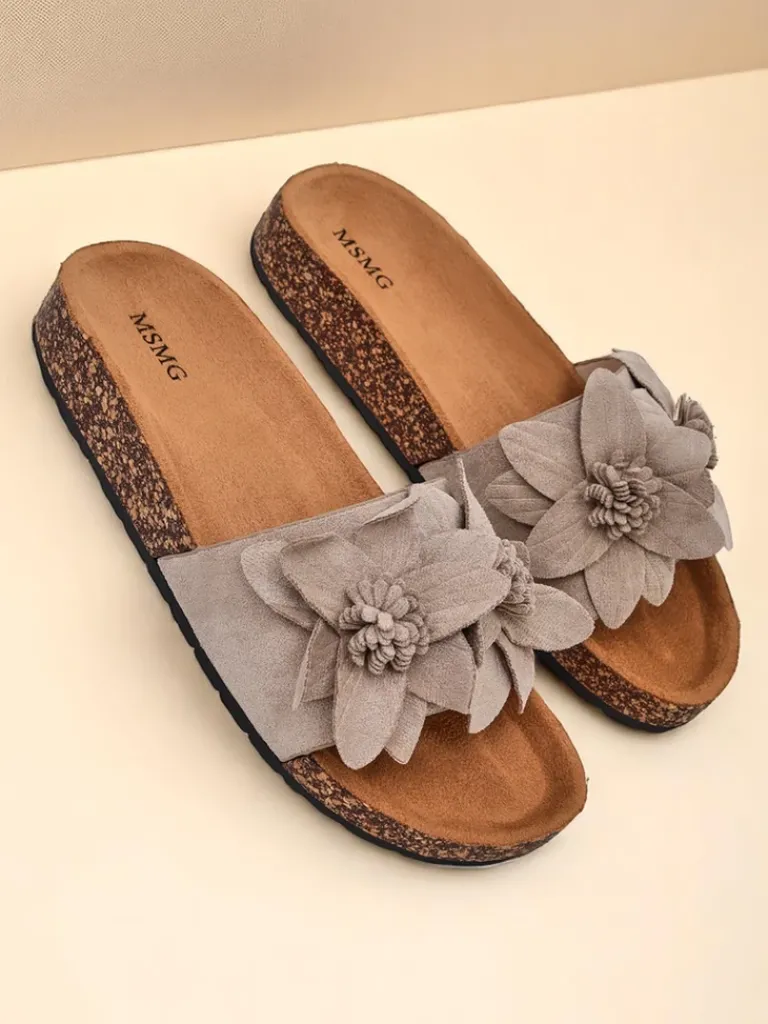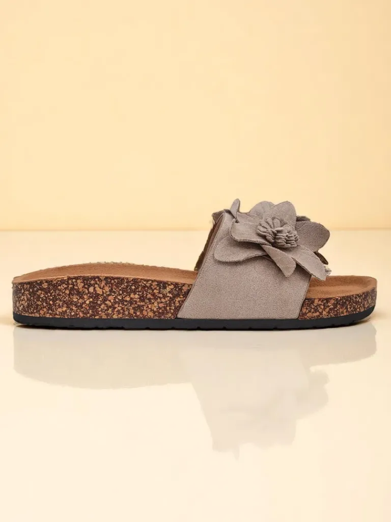 - Przepiękne klapki damskie wykonane ze skóry ekologicznej zamszowej, zdobione kwiatuszkami. Gumowa podeszwa zdobiona materiałem a’la korek. Model w ciekawej kolorystyce. Idealnie uzupełnią letnie stylizacje!
