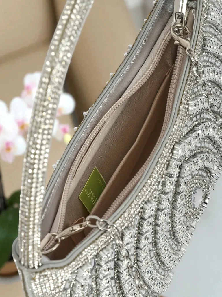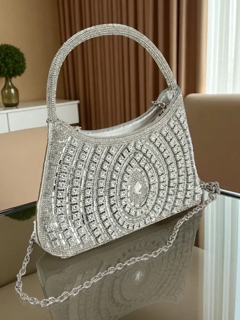 - Elegancka kopertówka z połyskującymi cyrkoniami, 1 komora, zamykana na zamek. Stylowe uszy i ozdobny łańcuszek dodają szyku. Idealna na wyjątkowe okazje – olśniewaj z klasą!
