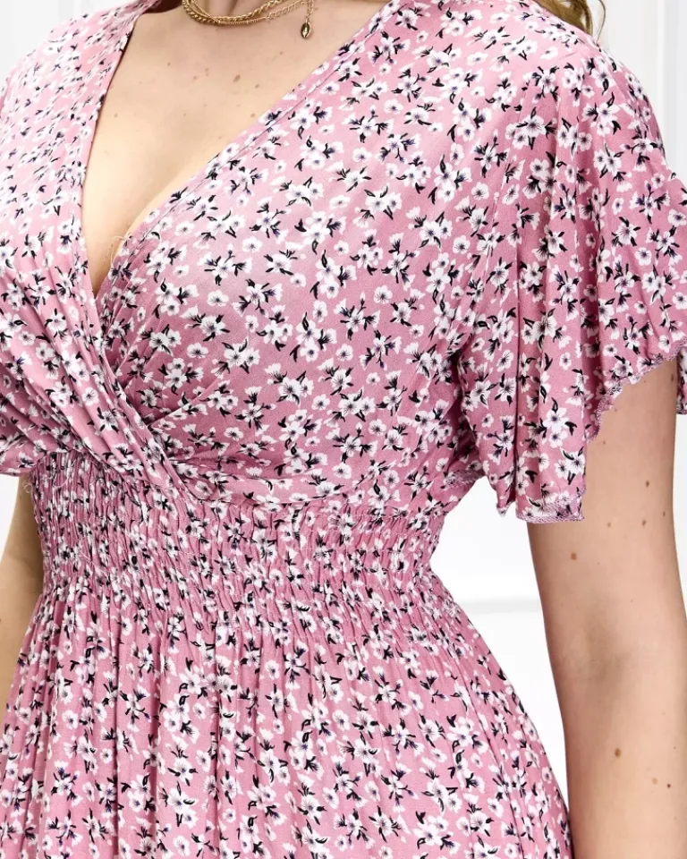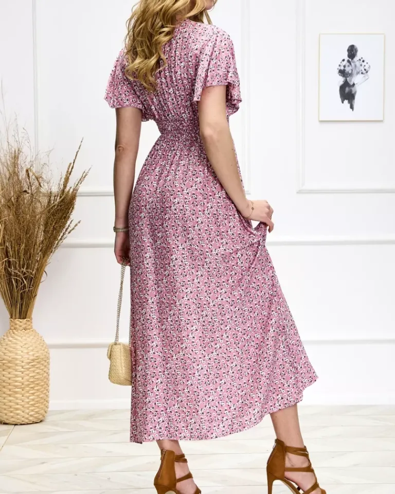 - Damska sukienka w kwiaty o długości midi, wykonana z miękkiej i przyjemniej w dotyku tkaniny. Model z kopertowym dekoltem, posiada krótkie rękawy i szeroką gumę podkreślającą talię. Niezbędny element garderoby! UWAGA: Dokładność pomiaru (+/-) 1 cm.