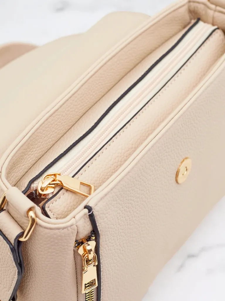 - Kompaktowa torebka z eko skóry z jedną komorą i dwiema praktycznymi kieszonkami. Regulowany pasek pozwala dopasować długość, a ozdobny front dodaje elegancji. Idealna na co dzień – łączy styl i funkcjonalność w lekkiej formie.