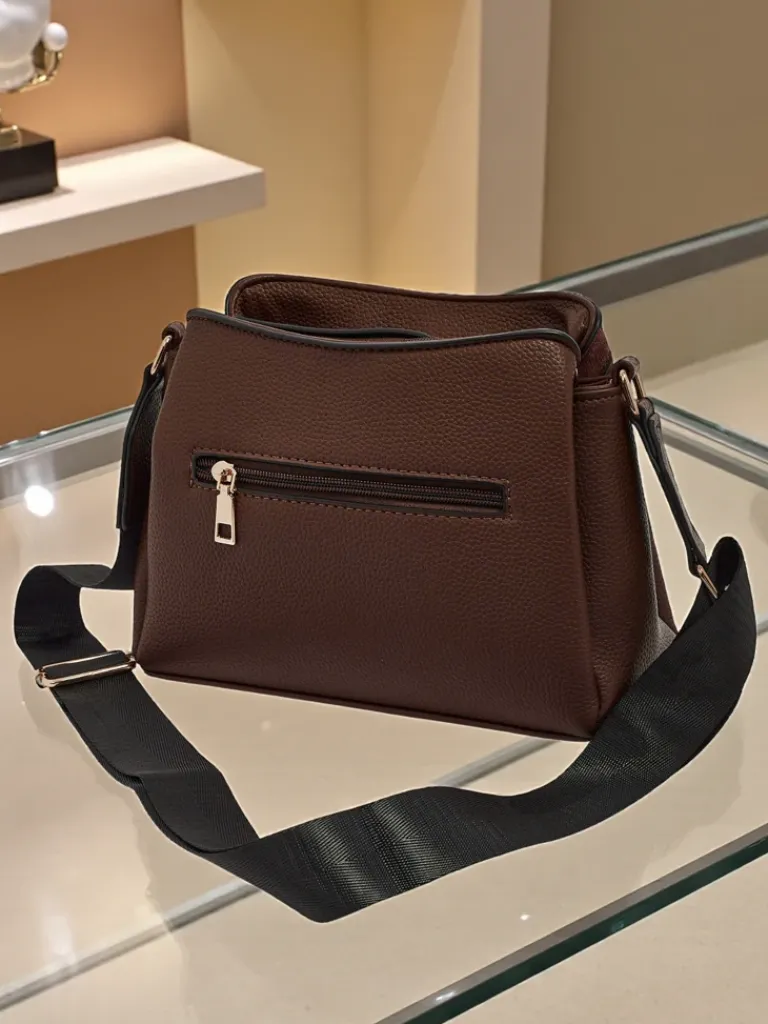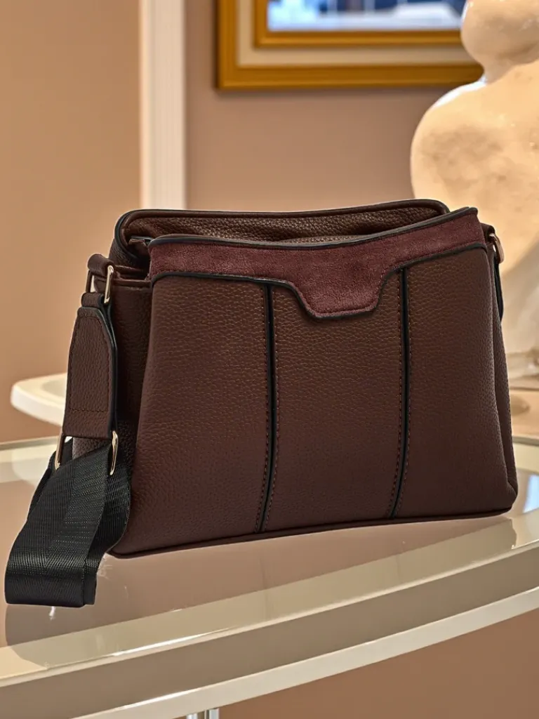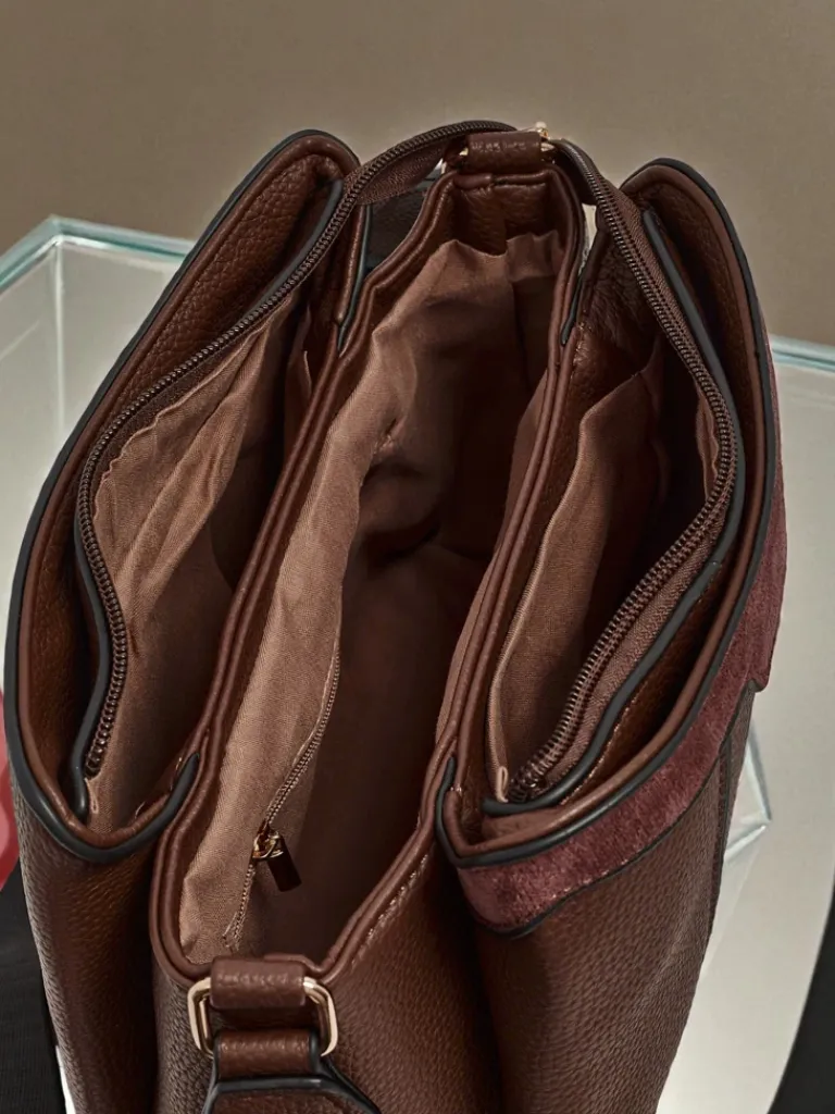 - Mała torebka wykonana z połączenia eko skóry i eko zamszu. 3 komory, 3 kieszonki, zamek oraz regulowany pasek. Styl i funkcjonalność w perfekcyjnym wydaniu.