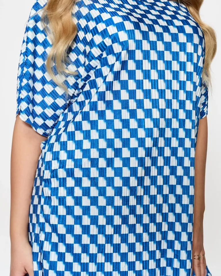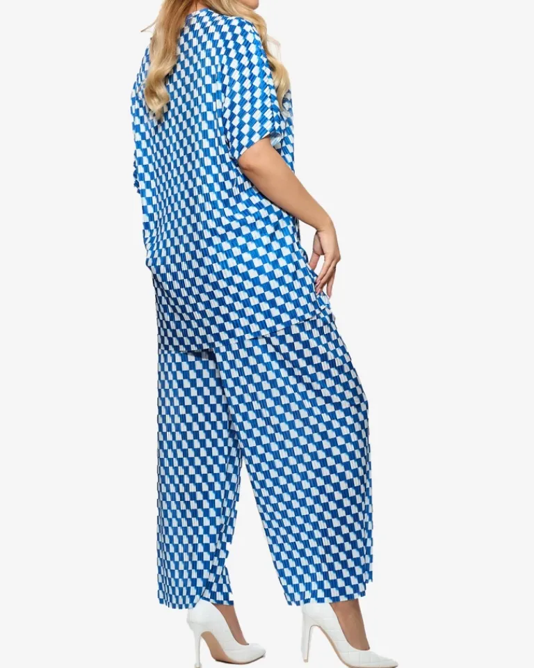 - Wzorzysty damski komplet wykonany ze śliskiej tkaniny plisowanej. Bluzka z okrągłym dekoltem, posiada krótkie rękawy. Spodnie typu palazzo z szeroką dumą w pasie i ozdobnymi troczkami. UWAGA: Dokładność pomiaru (+/-) 1 cm.