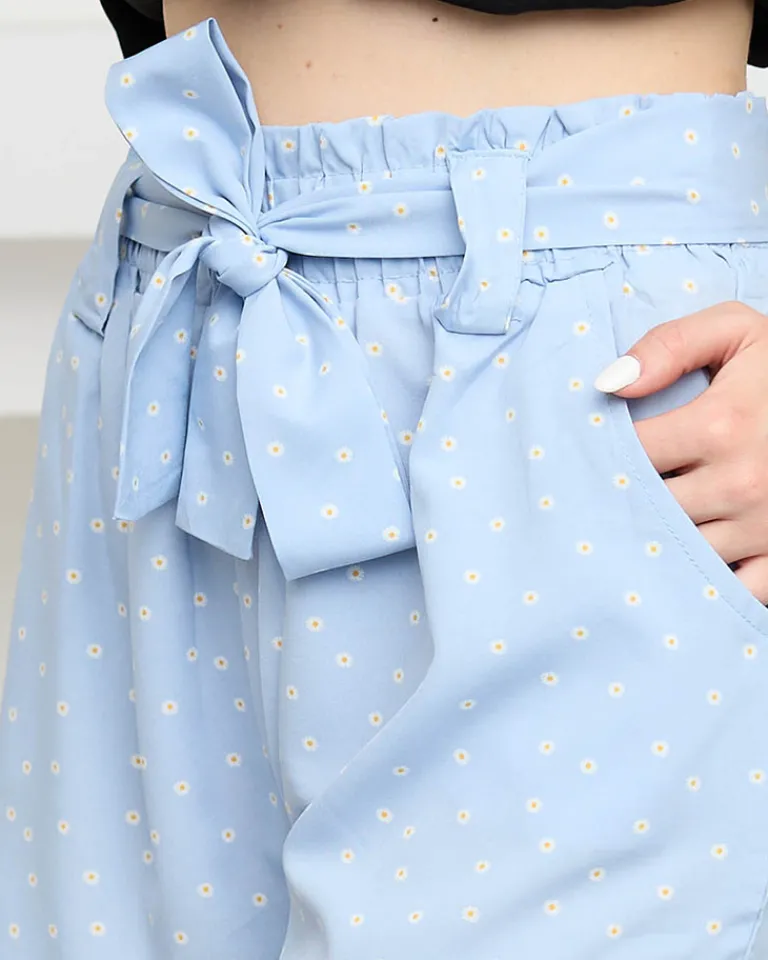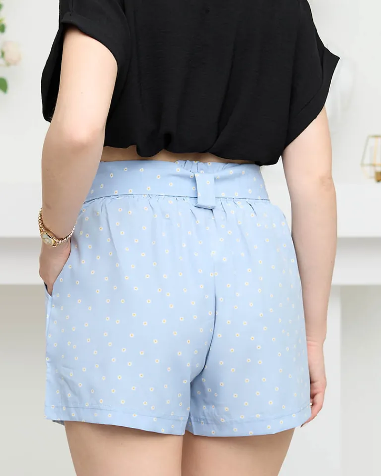 - Wygodne i zwiewne krótkie spodenki wykonane z tkaniny bawełnianej. Model z 2 kieszonkami, elastyczną gumką i dodatkowym wiązanym paskiem w pasie. Spodenki w drobne letnie kwiatki! UWAGA: dokładność pomiaru (+/-) 1 cm. Wymiary mierzone na płasko.