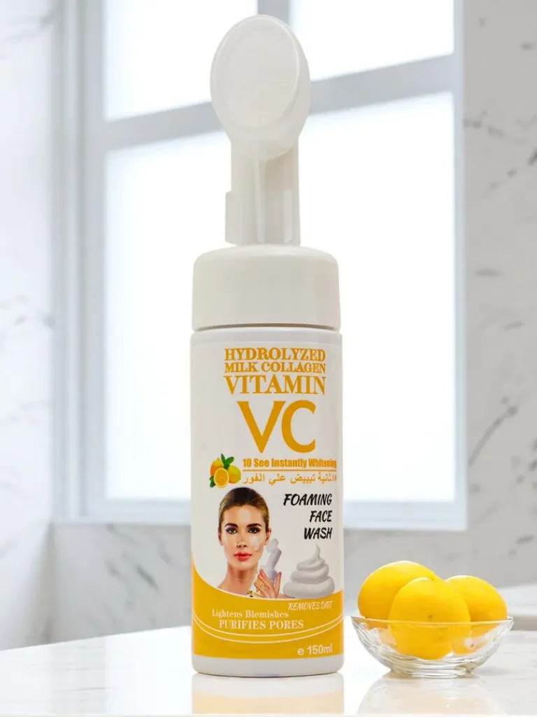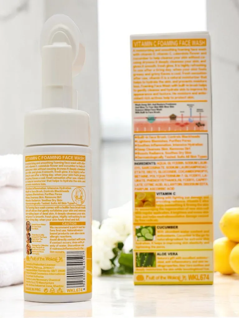 - Oczyszczająca pianka do twarzy z witaminą C i szczoteczką. Delikatnie usuwa zanieczyszczenia, rozświetla skórę i działa przeciwstarzeniowo, pozostawiając cerę świeżą, gładką i promienną.