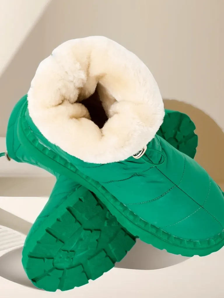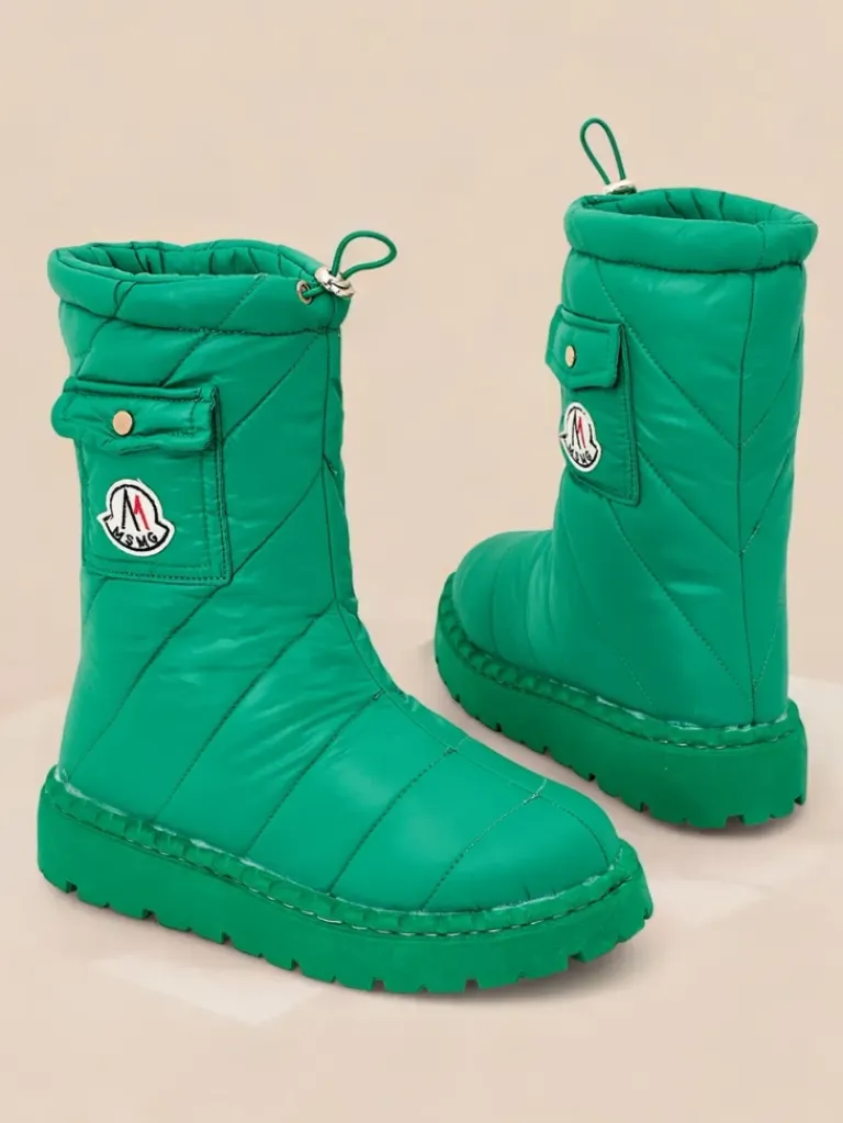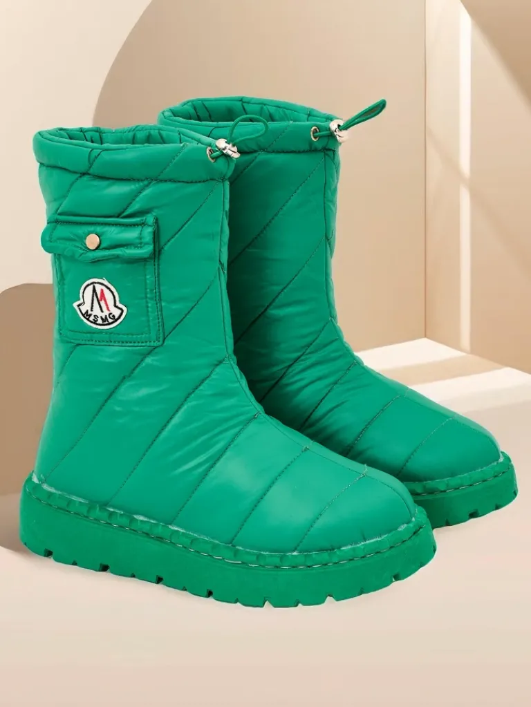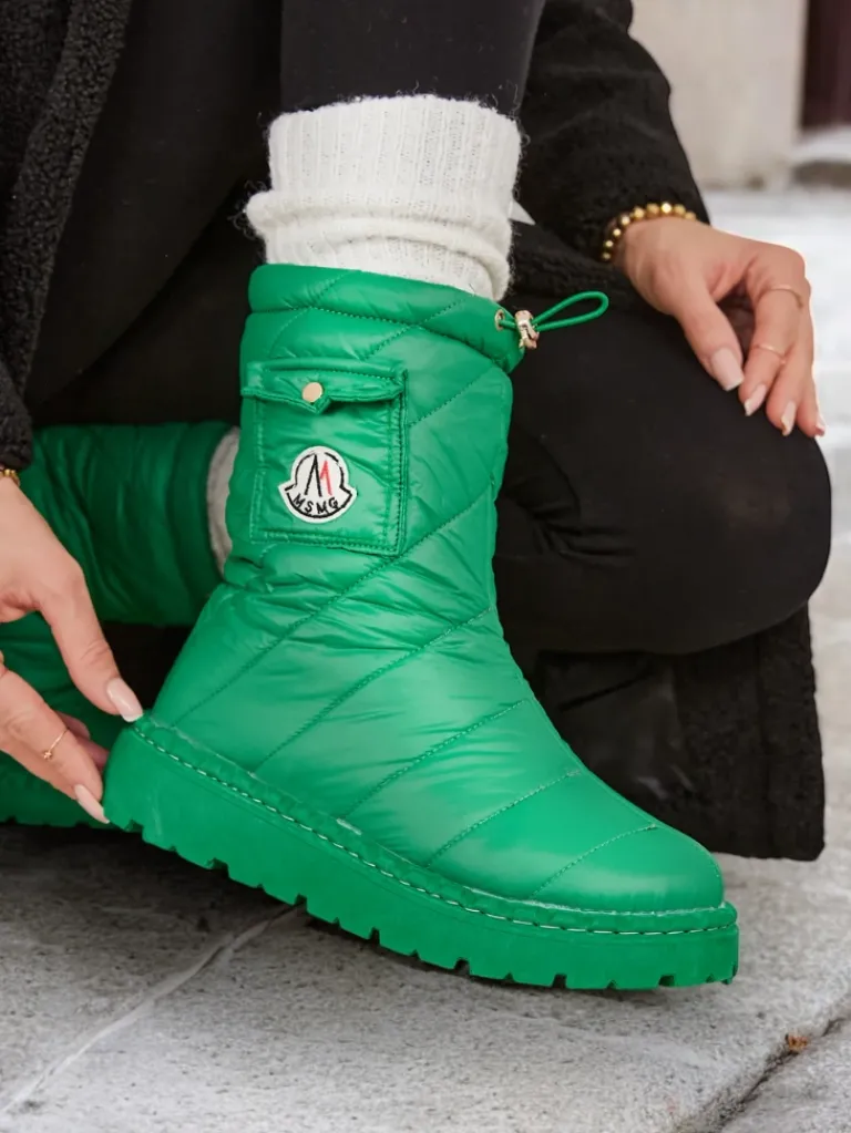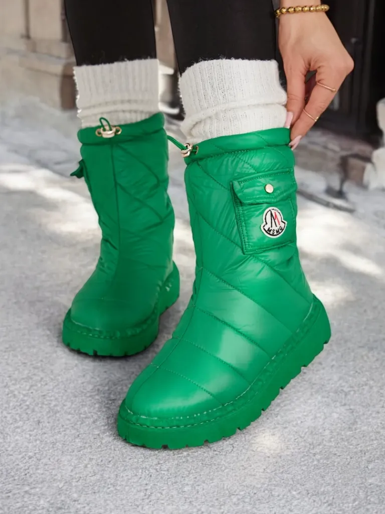 - Damskie obuwie typu śniegowce z cholewką wykonaną z materiału a’la cerata. W środku ocieplenie w formie futerka, obuwie posiada ściągacz pozwalający na idealne dopasowanie. Idealne na chłodniejszą porę roku!