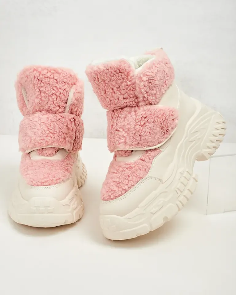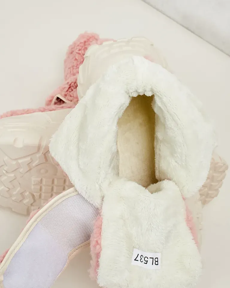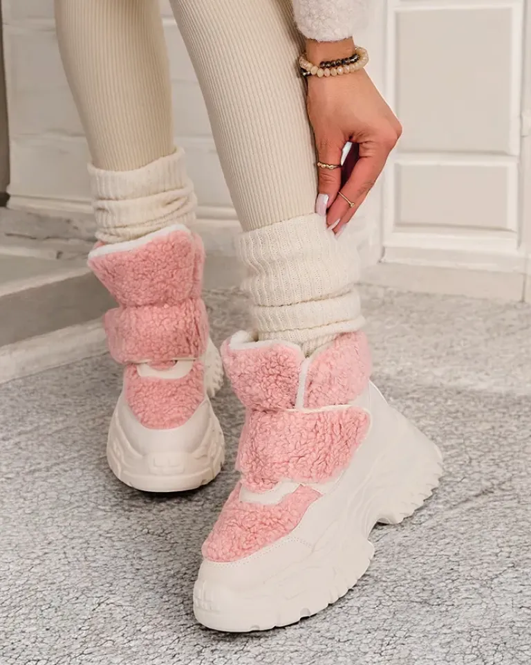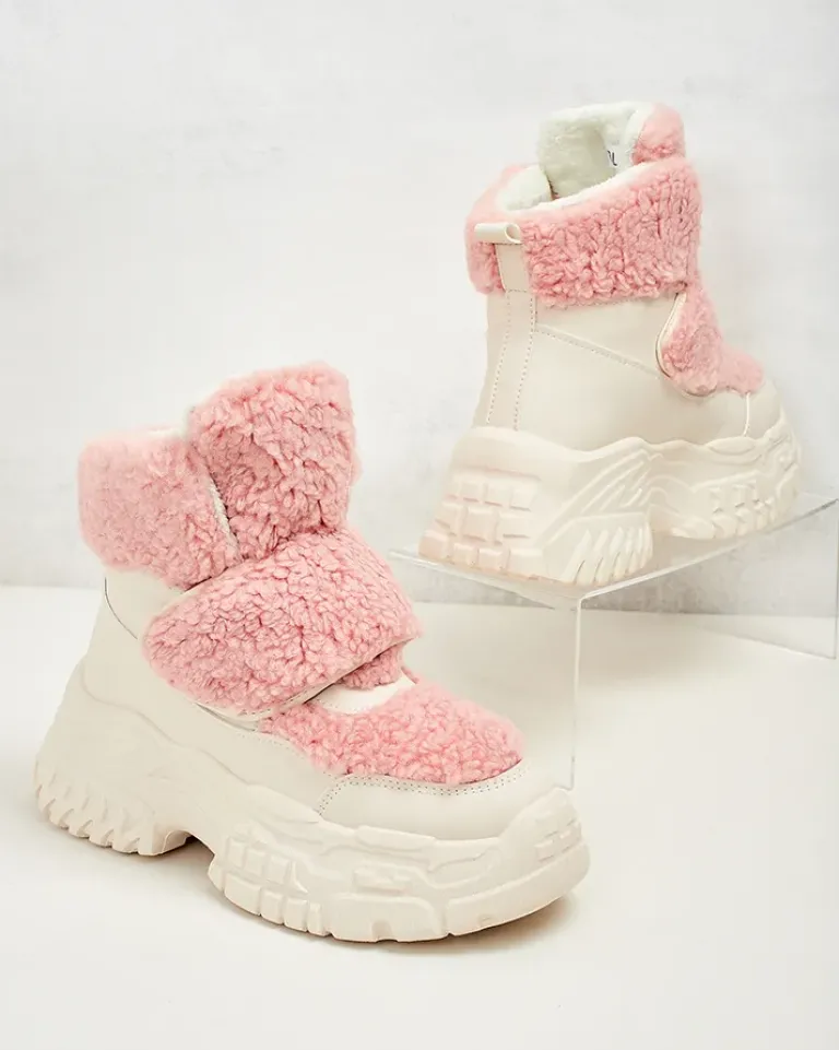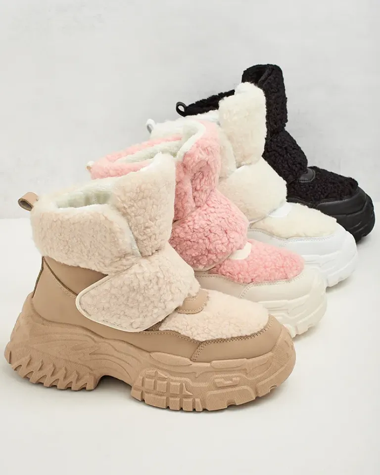 - Ponadczasowe damskie obuwie typu śniegowce. Cholewka wykonana ze skóry ekologicznej ze wstawkami a’la kożuszek. W środku ocieplenie w formie futerka, obuwie posiada zapięcie na rzep. Idealne na chłodniejszą porę roku!
