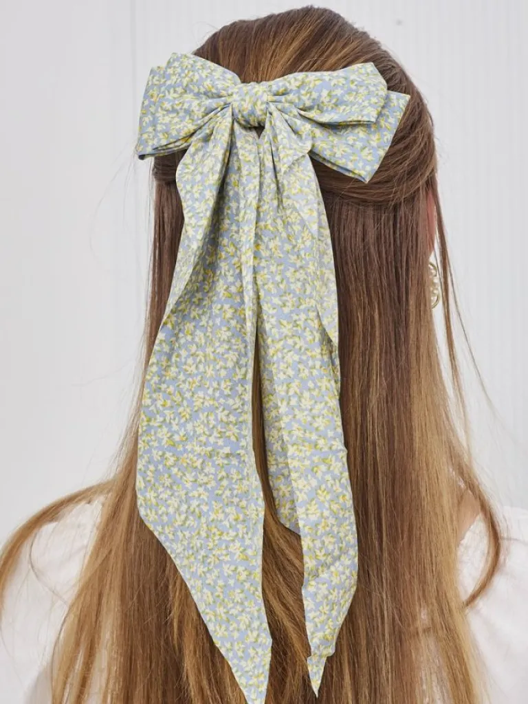 - Spinka do włosów z kokardką i długimi wstążkami w kwiatuszki. Delikatny, romantyczny dodatek, który pięknie podkreśla fryzurę, dodając lekkości i świeżości każdemu lookowi.