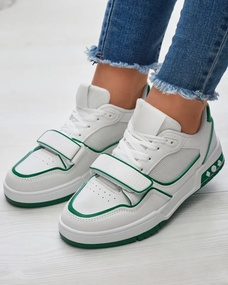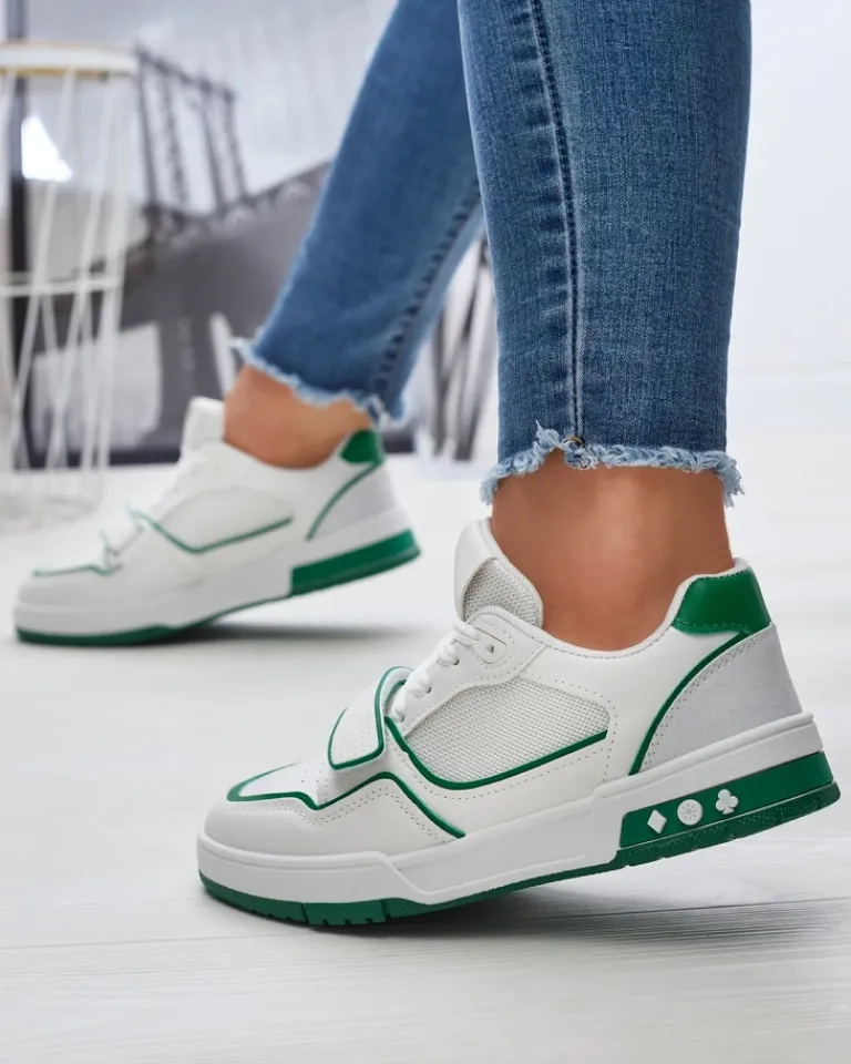 - Modne sportowe sneakersy damskie wykonane z połączenia skóry ekologicznej oraz tkaniny. Buty sznurowane i zapinane dodatkowo na rzep. Dopełnienie każdego sportowego outfitu!