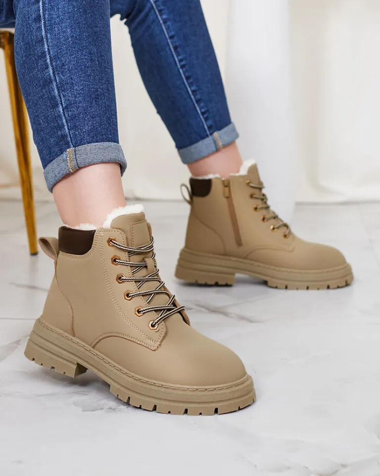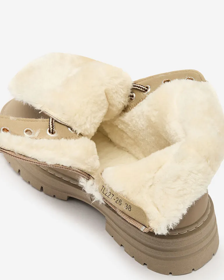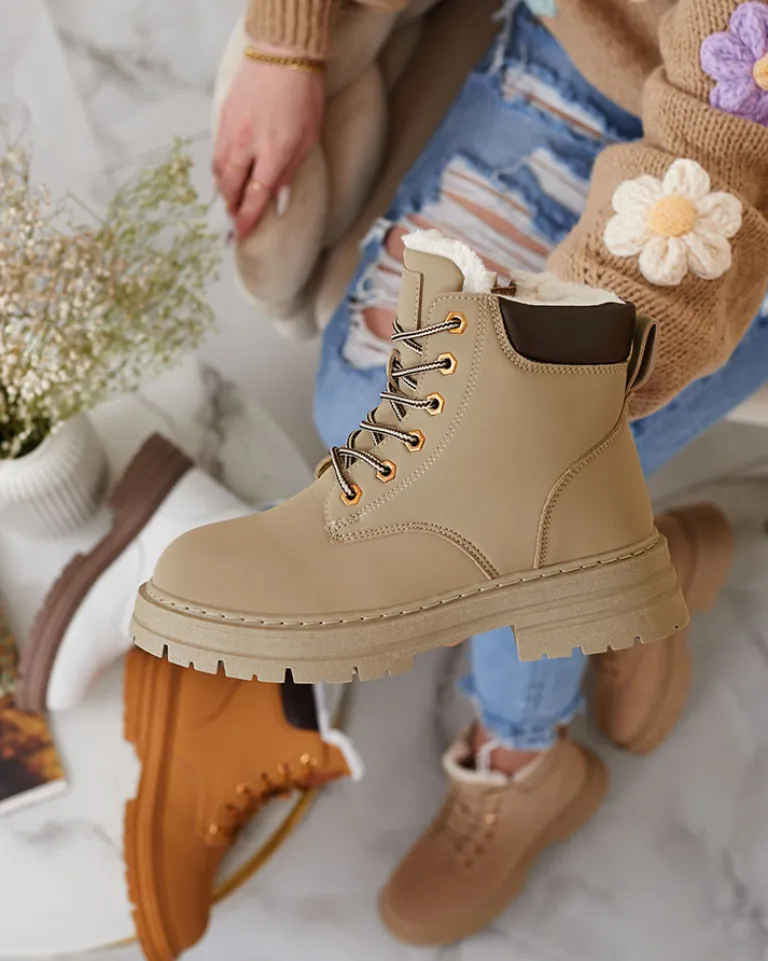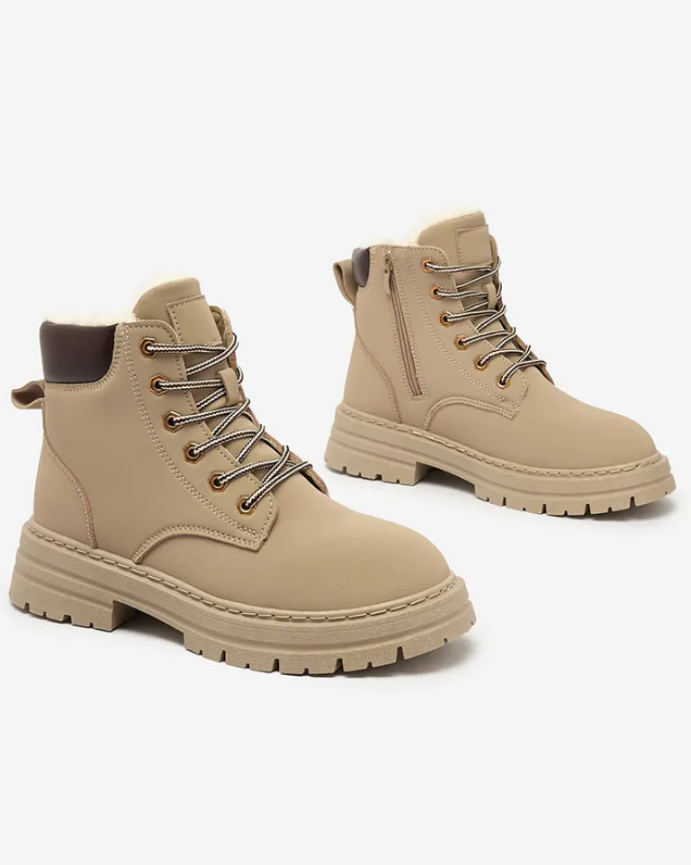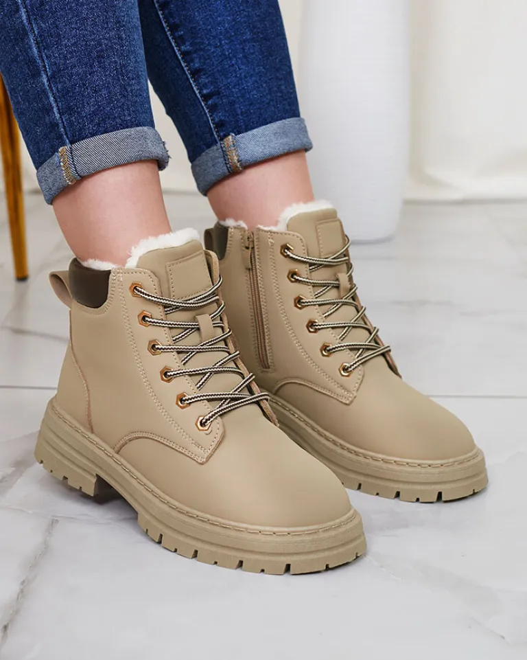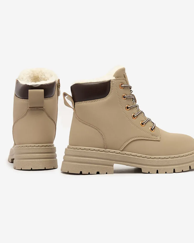 - Ponadczasowe damskie botki a’la trapery. Sznurowana cholewka wykonana jest ze skóry ekologicznej matowej, środek ocieplony delikatnym futerkiem. Super dodatek do Twoich casualowych outfitów!
