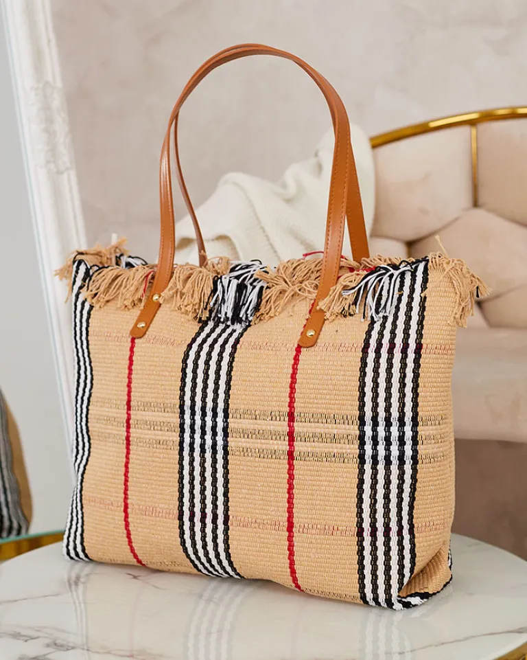 - Duża torba damska, wykonana z plecionej tkaniny. Model posiada 1 komorę oraz jest zapinany na zamek błyskawiczny. Idealna na co dzień czy na plażę!