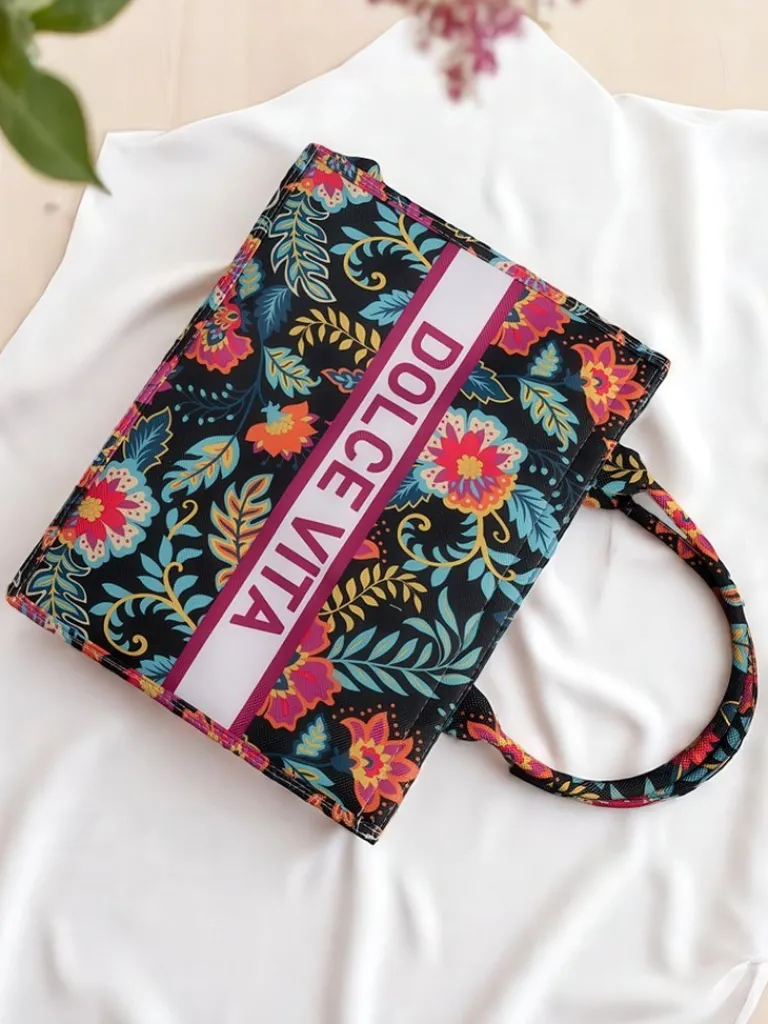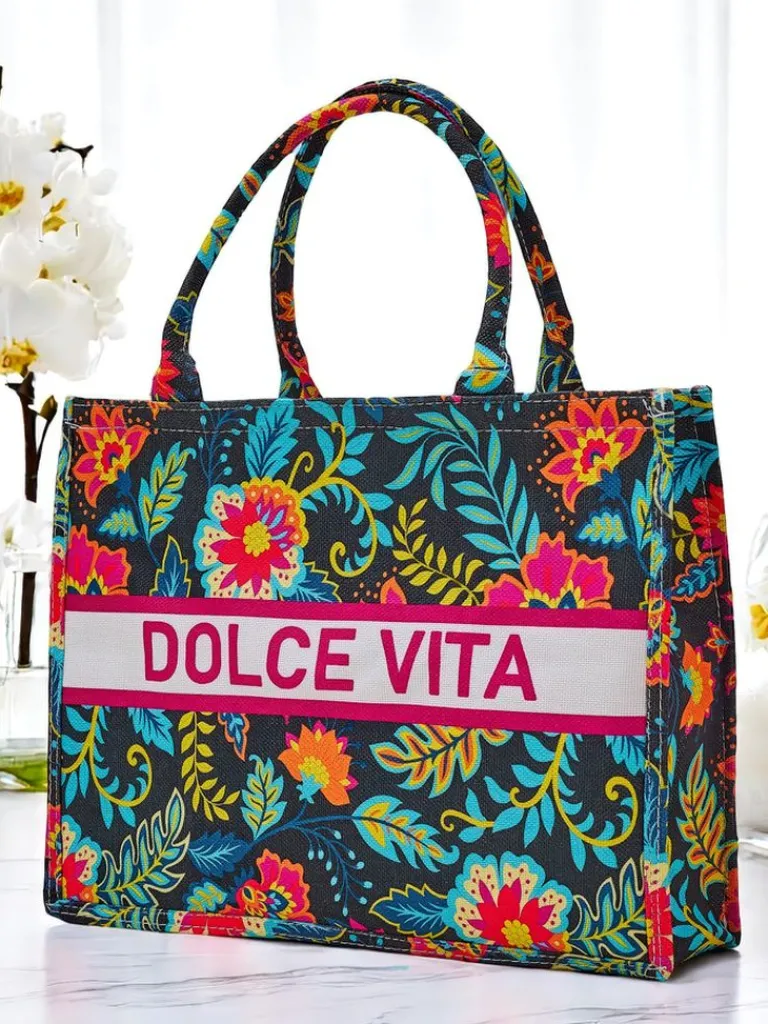 - Duża, materiałowa torebka damska z kolorowym, wzorzystym motywem i napisem DOLCE VITA. 1 komora, lekka i pojemna – idealna na lato i stylowe wyjścia!