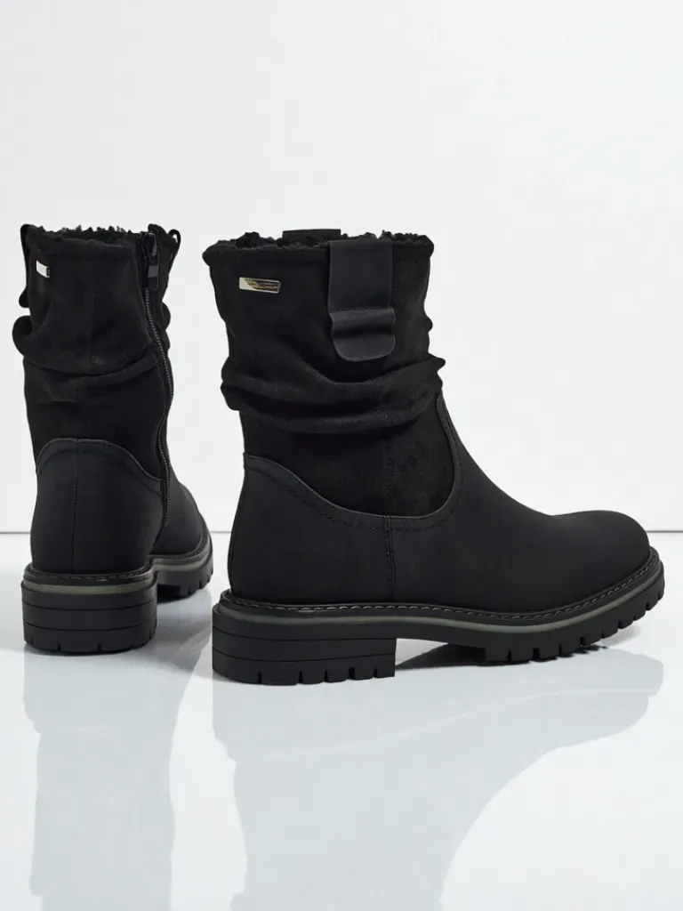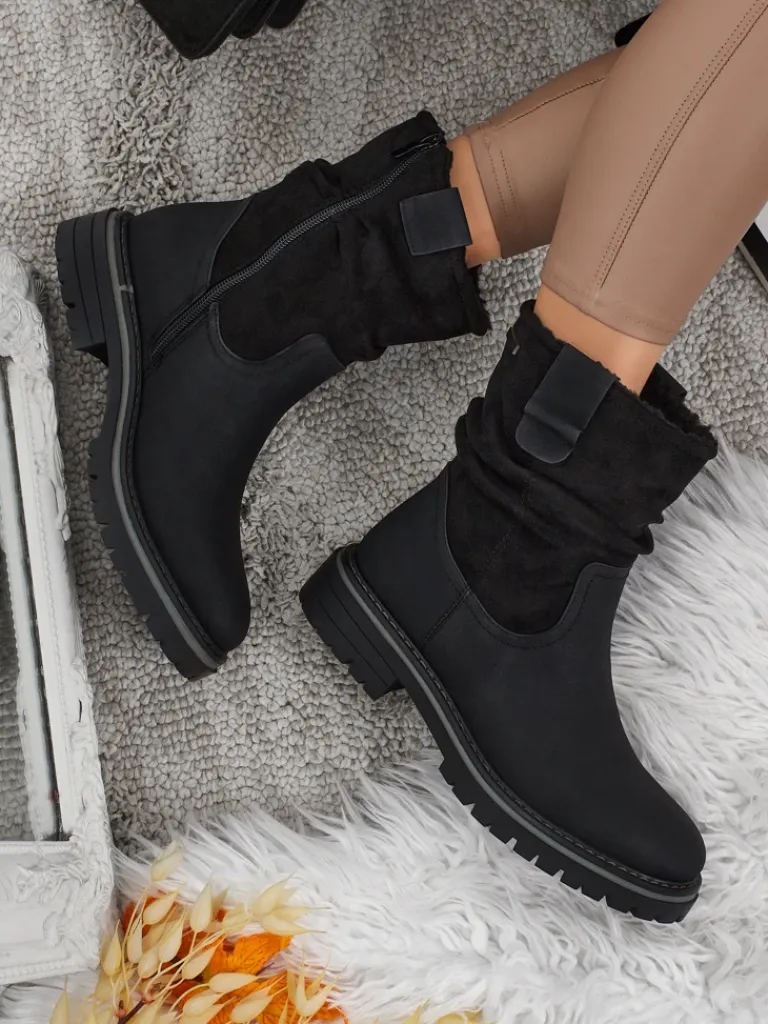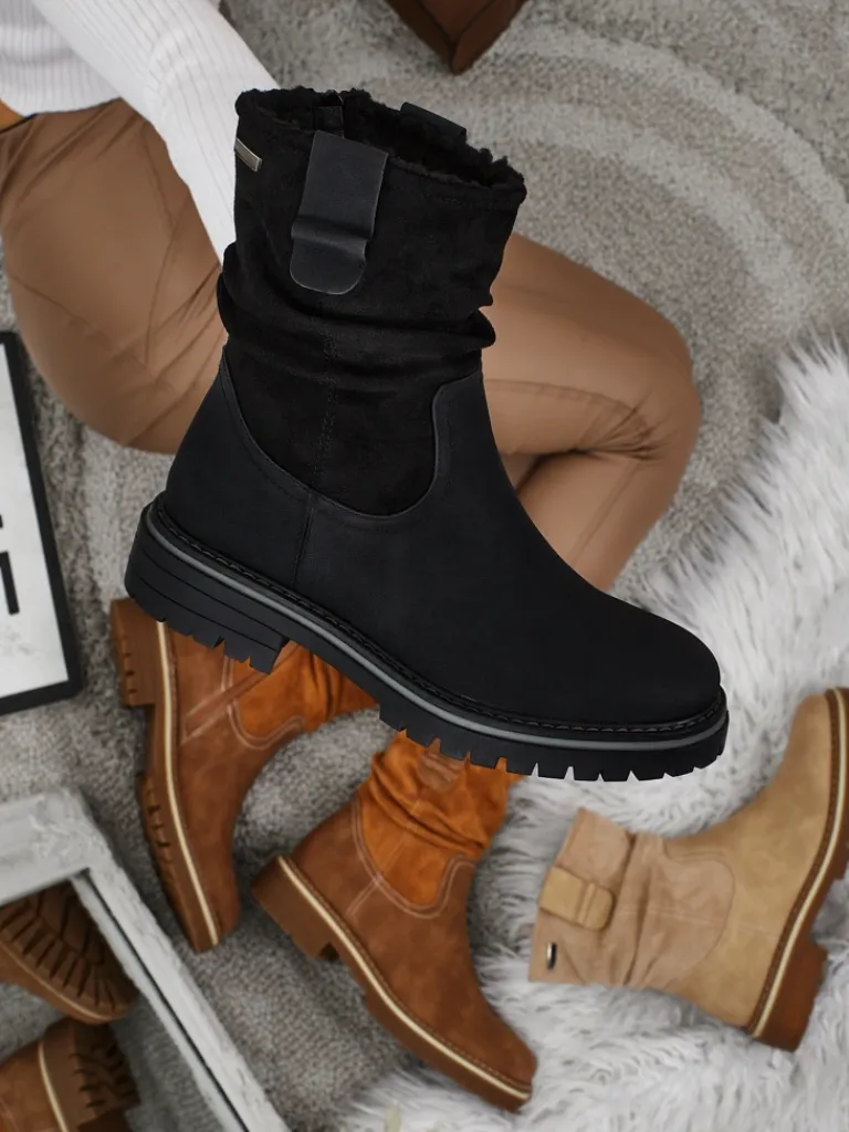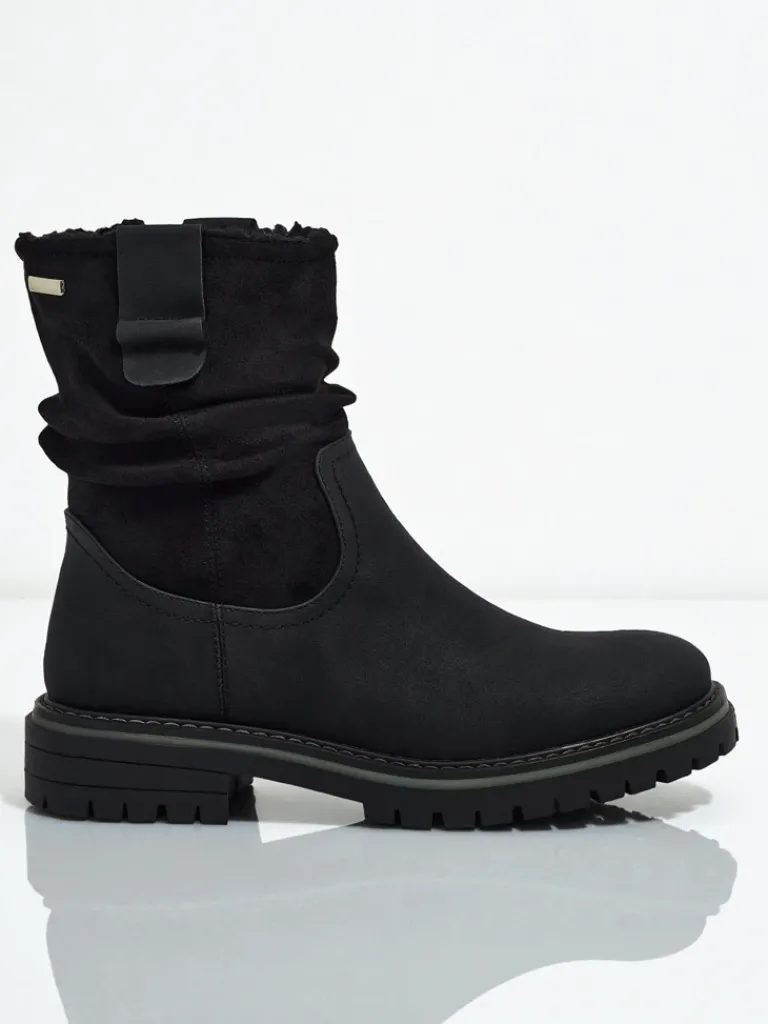- Damskie botki zapinane na zamek. Model wykonany ze skóry ekologicznej zamszowej, na płaskiej podeszwie. Posiada ocieplenie a’la futerko. Zdobione lekko marszczoną cholewką. Wygodny i stylowy, idealny na jesień!