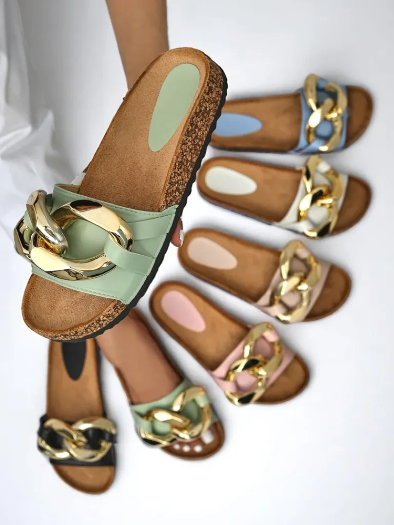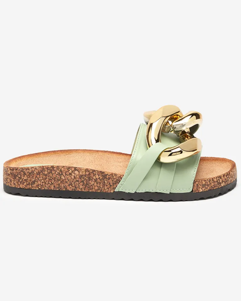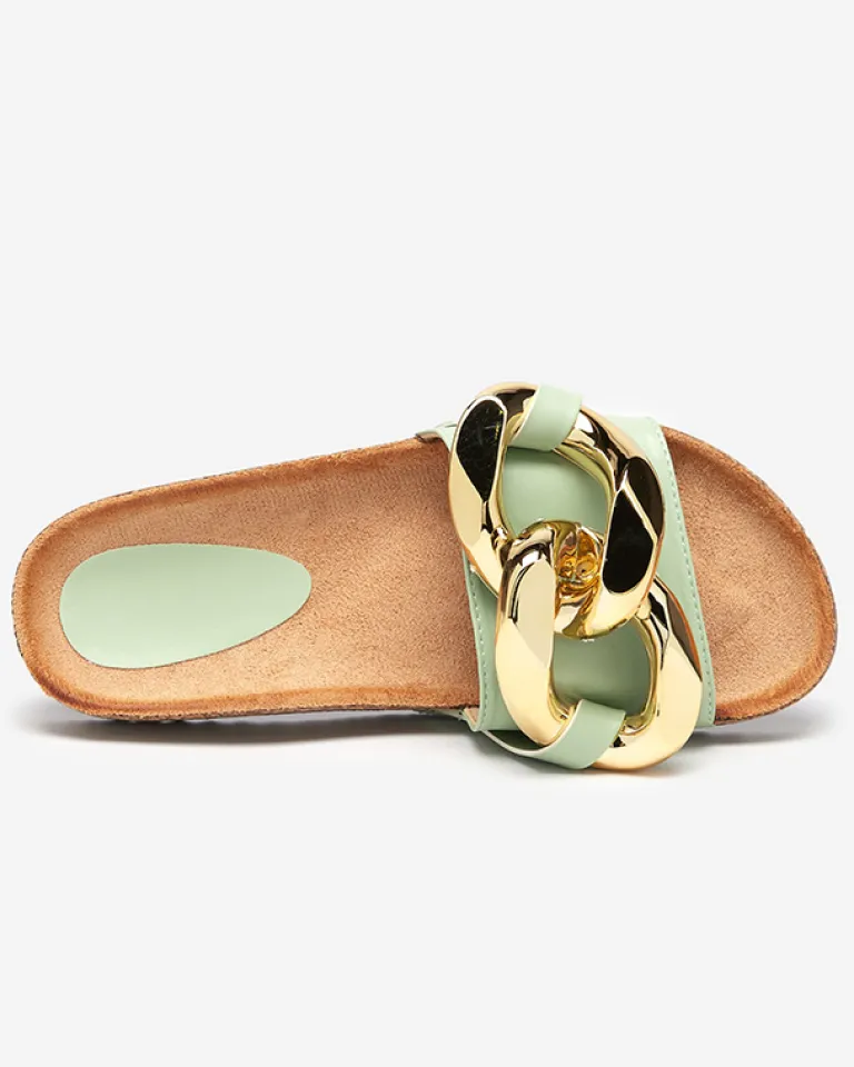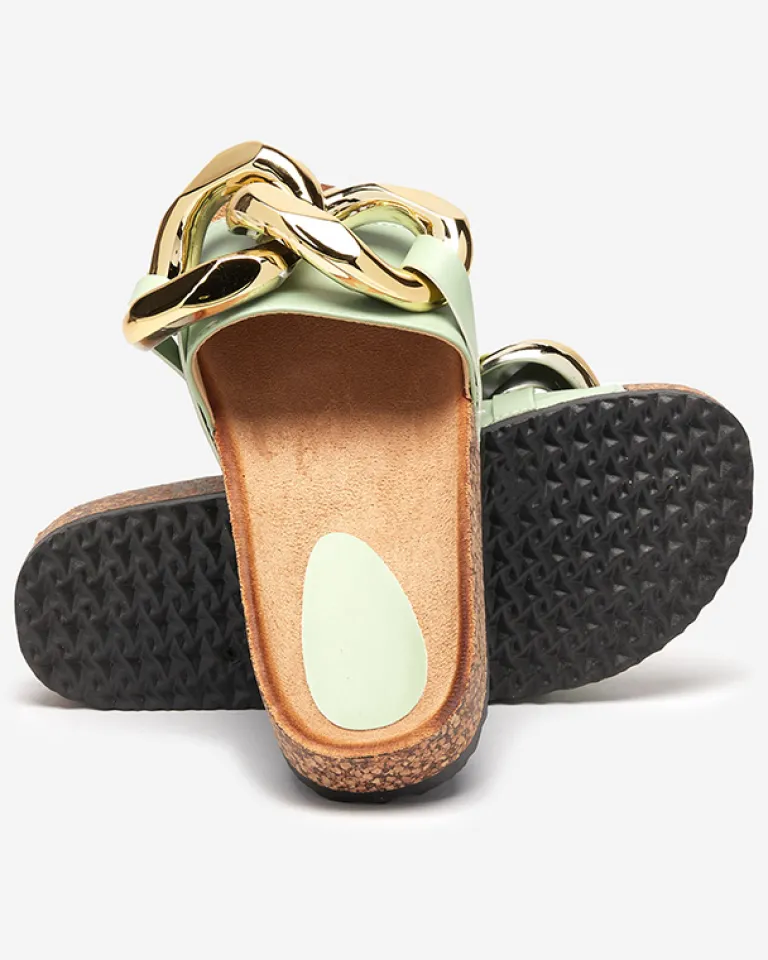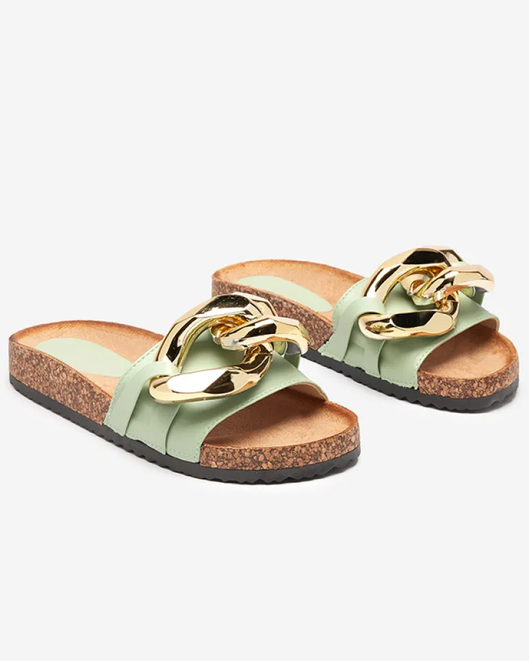 - Stylowe klapki damskie wykonane ze skóry ekologicznej, wkładka zaś z eko skóry zamszowej. Posiadają złotą ozdobę na paseczku. Model na płaskiej i gumowej podeszwie z materiału a’la korek. Świetny dodatek do wielu letnich outfitów!