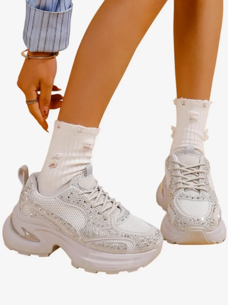 - Sneakersy damskie na platformie- perfekcyjne połączenie stylu i komfortu. Obuwie wykonane z tkaniny zdobionej cyrkoniami. Model sznurowany, posiada tkaninową wkładkę. Idealne dla aktywnych osób!