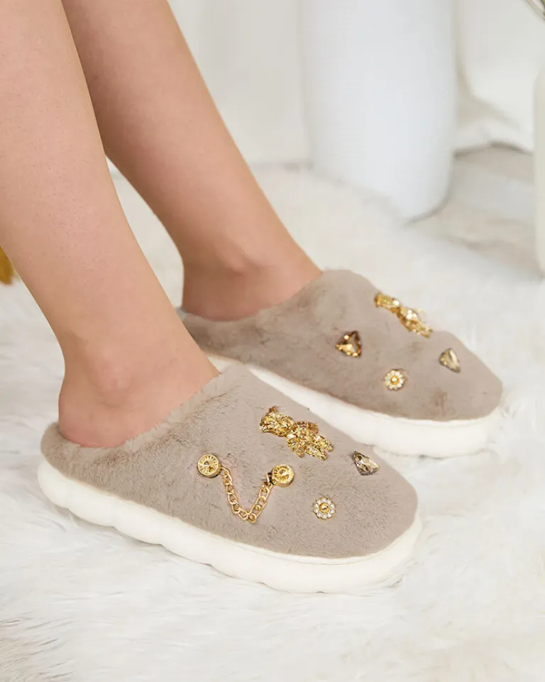 - Rewelacyjne damskie kapcie na płaskiej podeszwie, zdobione łańcuszkami i plastikowymi ozdobami w kształcie misia. Model wykonany z materiału imitującego futerko. Świetna propozycja dla domowych outfitów!