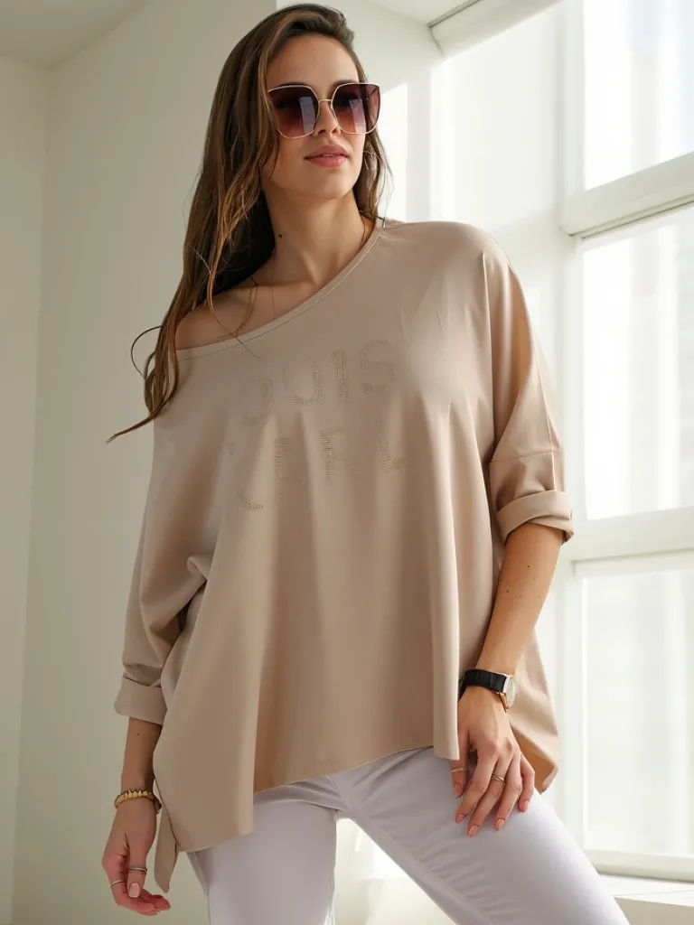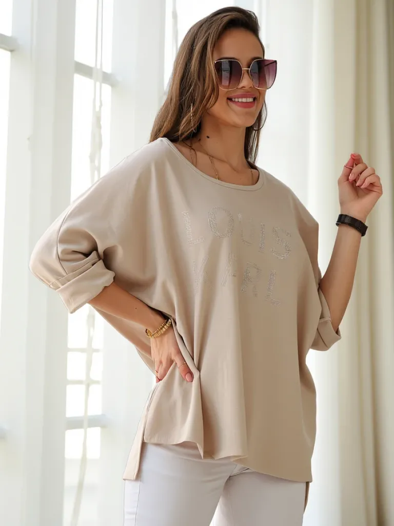 Wiskozowa damska bluzka z napisami z cyrkonii Bluzki / Koszule / Koszulki
