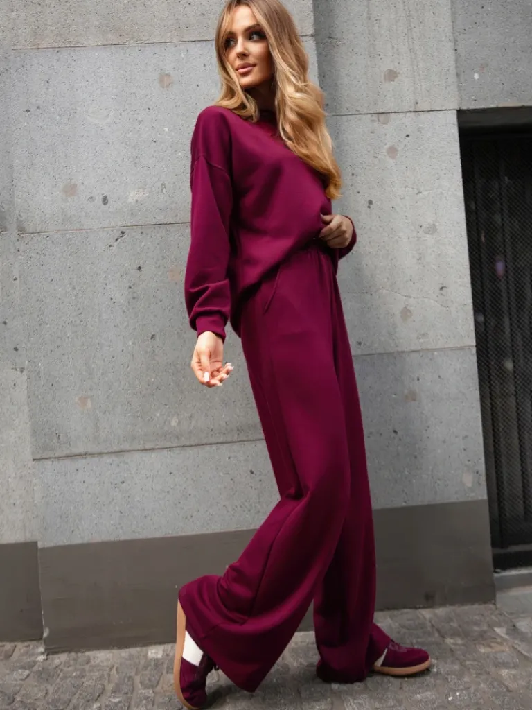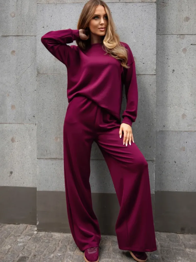 - Damski komplet dresowy wykonany z przyjemnego materiału wiskozowego. Bluza wkładana przez głowę. Długie, szerokie spodnie z gumą w pasie i na nogawkach, z 2 kieszeniami. Poczuj styl w tym wspaniałym komplecie!