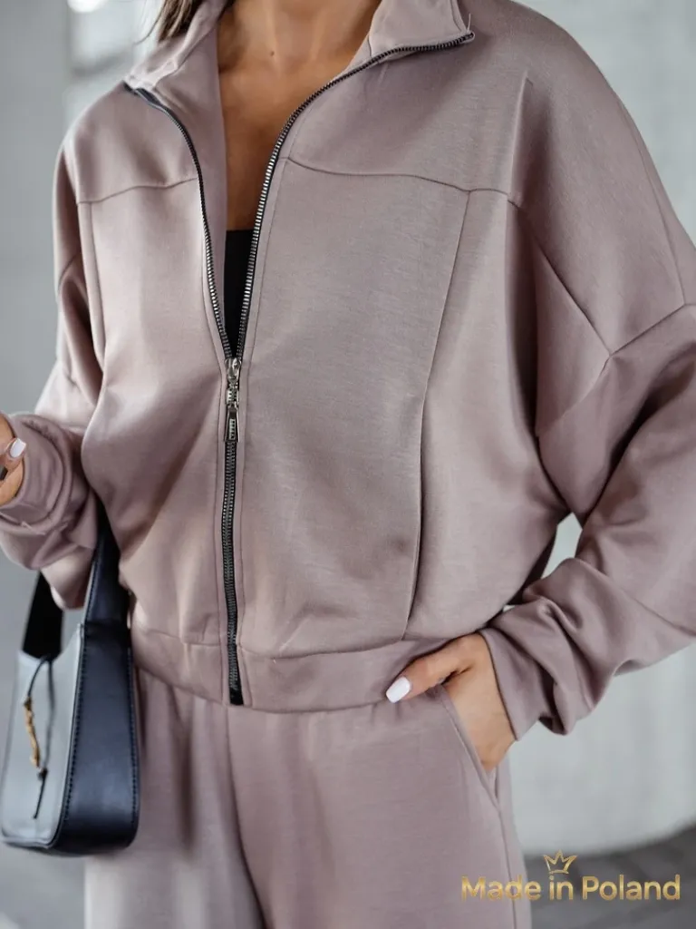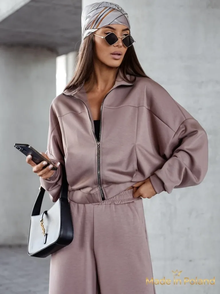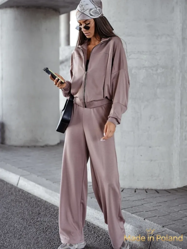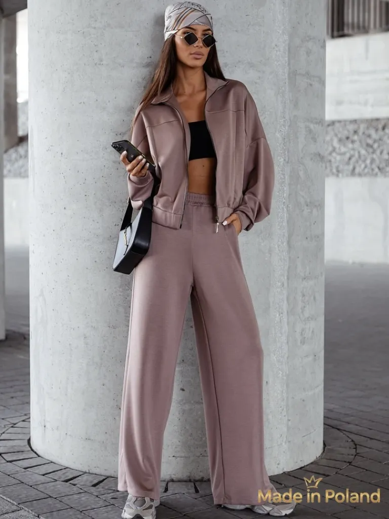 - Damski komplet dresowy wykonany z przyjemnego materiału wiskozowego. Bluza rozpinana. Długie, szerokie spodnie z gumą w pasie i na nogawkach, z 2 kieszeniami. Poczuj styl w tym wspaniałym komplecie!