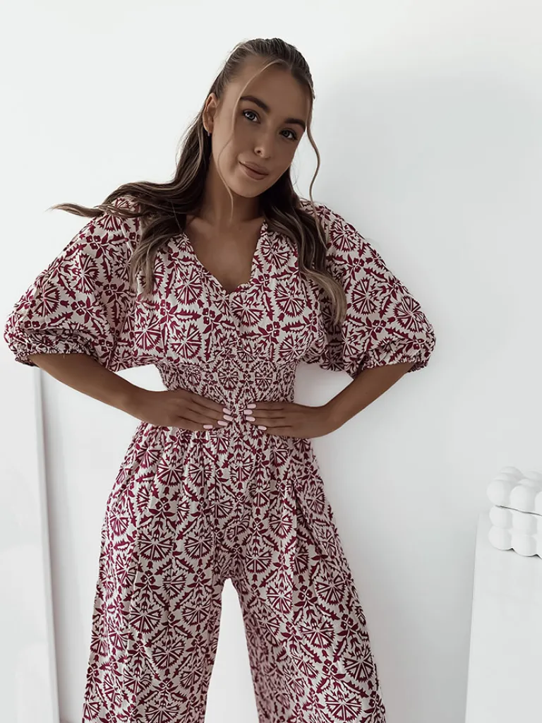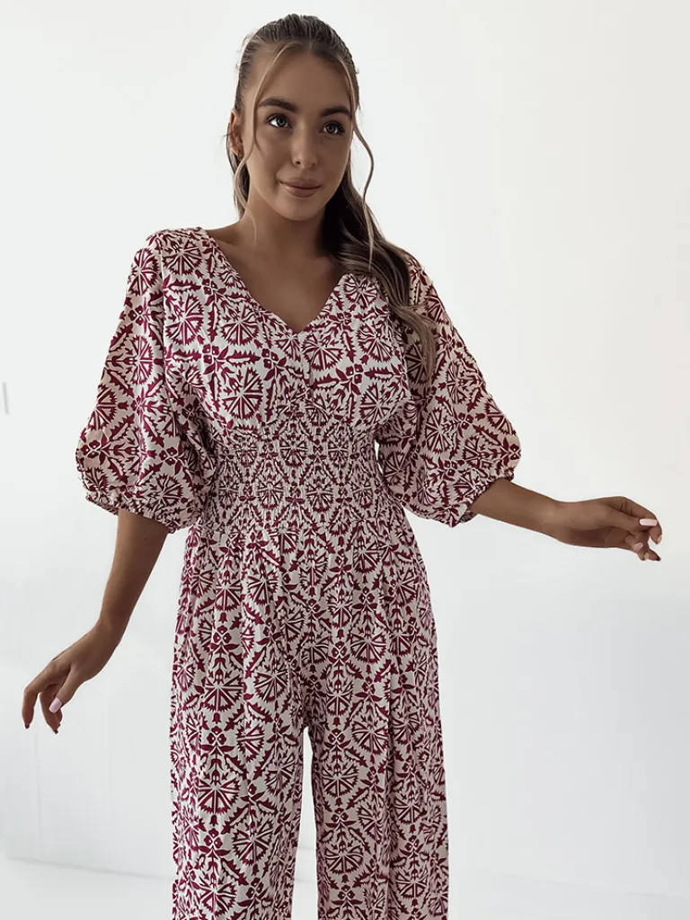- Wzorzysty kombinezon damski z krótkimi rękawami. Model z dekoltem V oraz gumą w talii. Produkt posiada szerokie, długie nogawki.