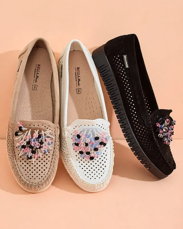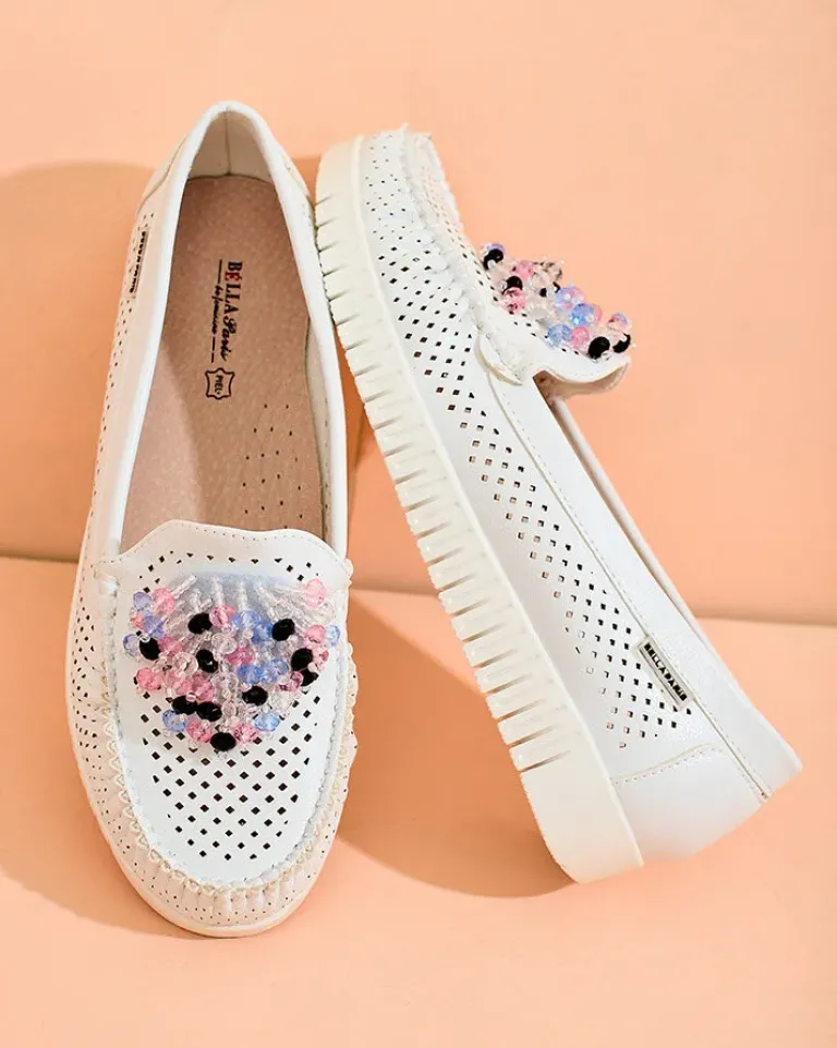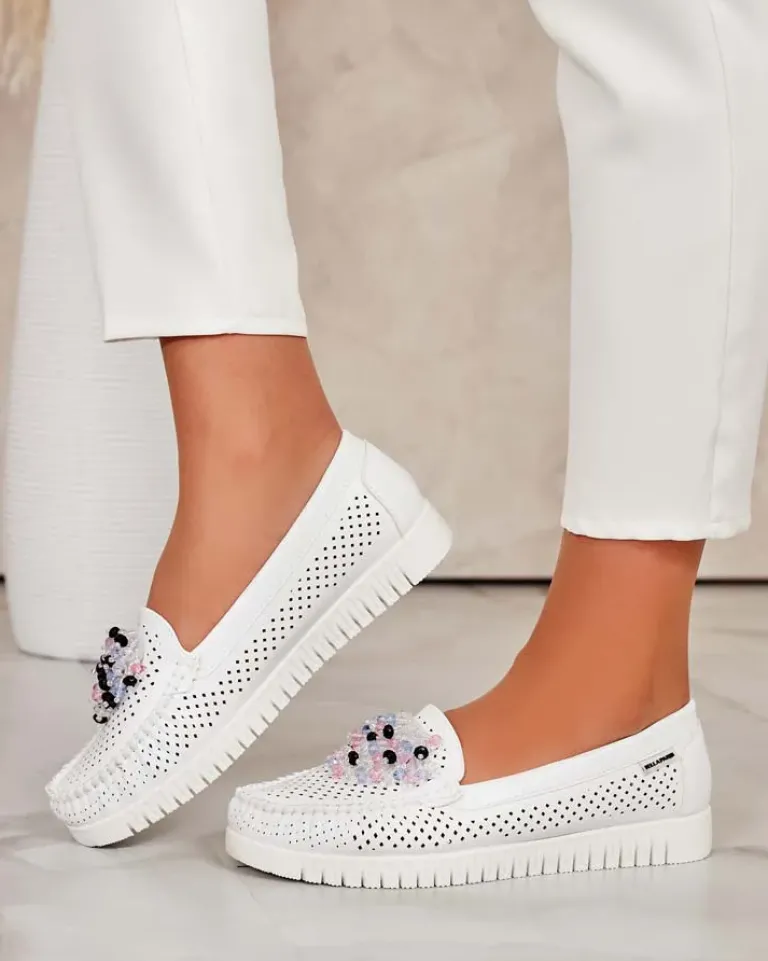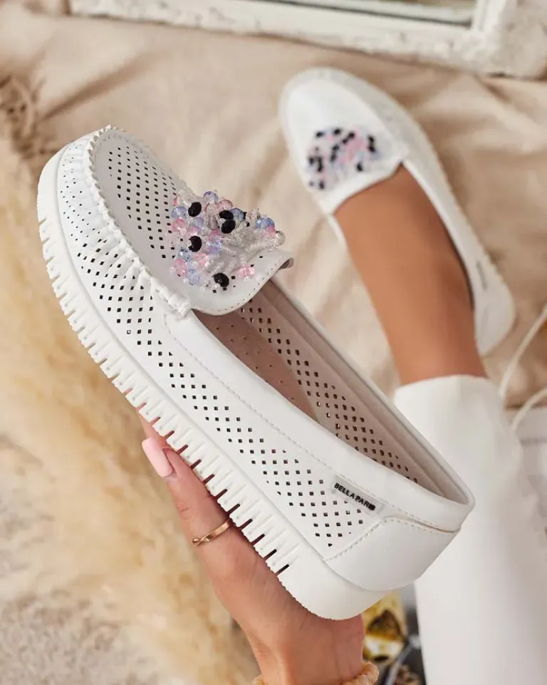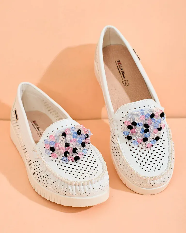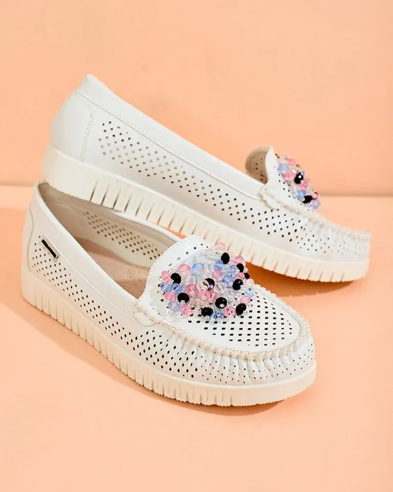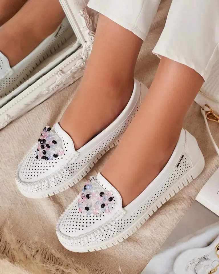 - Ażurowe damskie mokasyny na płaskiej podeszwie. Model jest wykonany ze skóry ekologicznej. W środku wkładka ze skóry naturalnej. Nosek zdobiony kolorowymi koralikami. Idealna baza na co dzień!