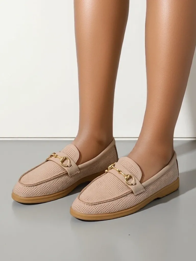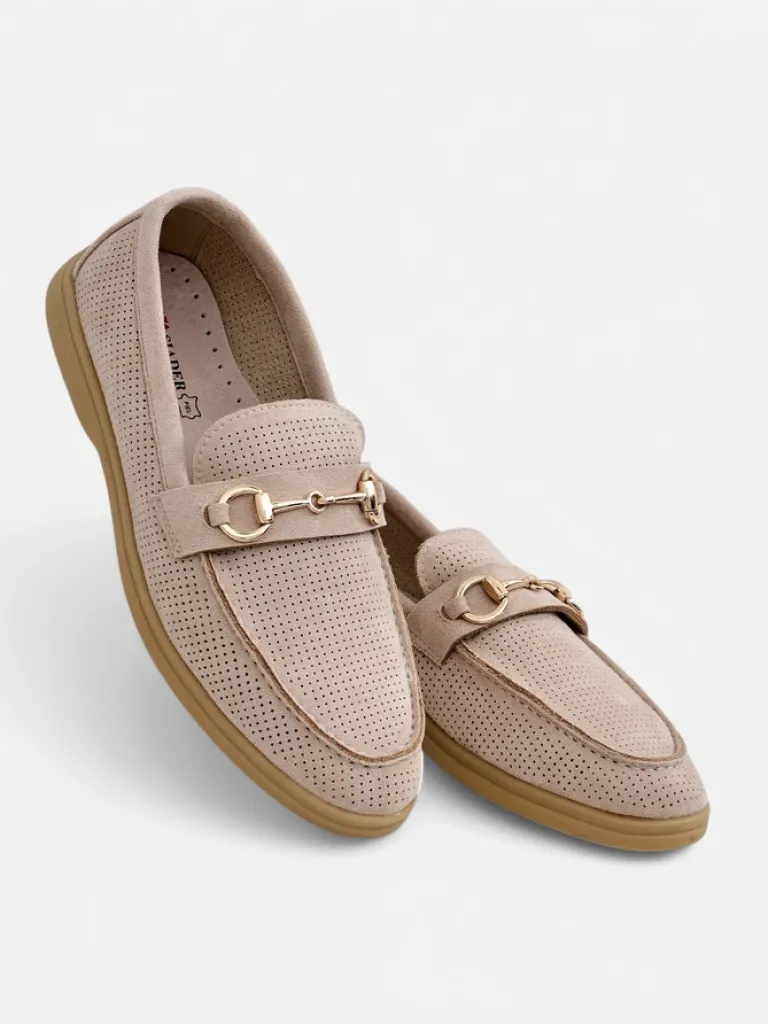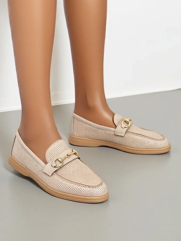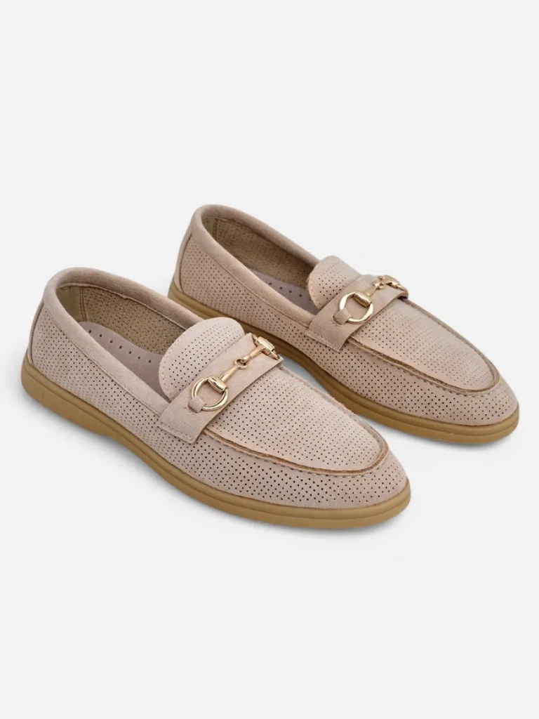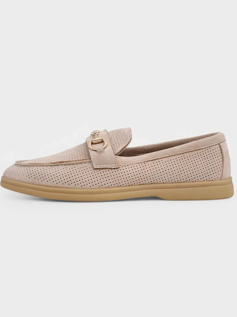 - Ażurowe damskie mokasyny na płaskiej podeszwie. Model wykonany ze skóry ekologicznej zamszowej z wypełnieniem ze skóry naturalnej. Obuwie posiada subtelną ozdobę na cholewce. Idealny dodatek do codziennych outfitów!