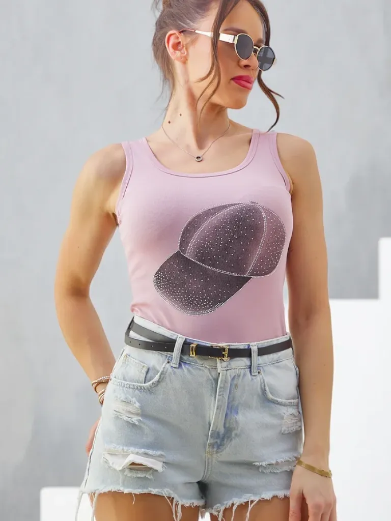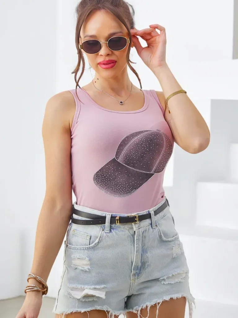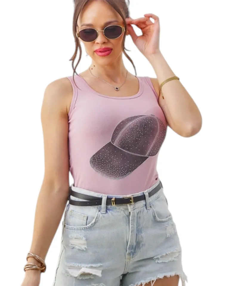 - Bawełniana damska bluzka na ramiączkach z nadrukiem czapeczki, łącząca wygodę z modnym akcentem. Idealna na letnie dni, dodaje luzu i stylu każdej casualowej stylizacji.
