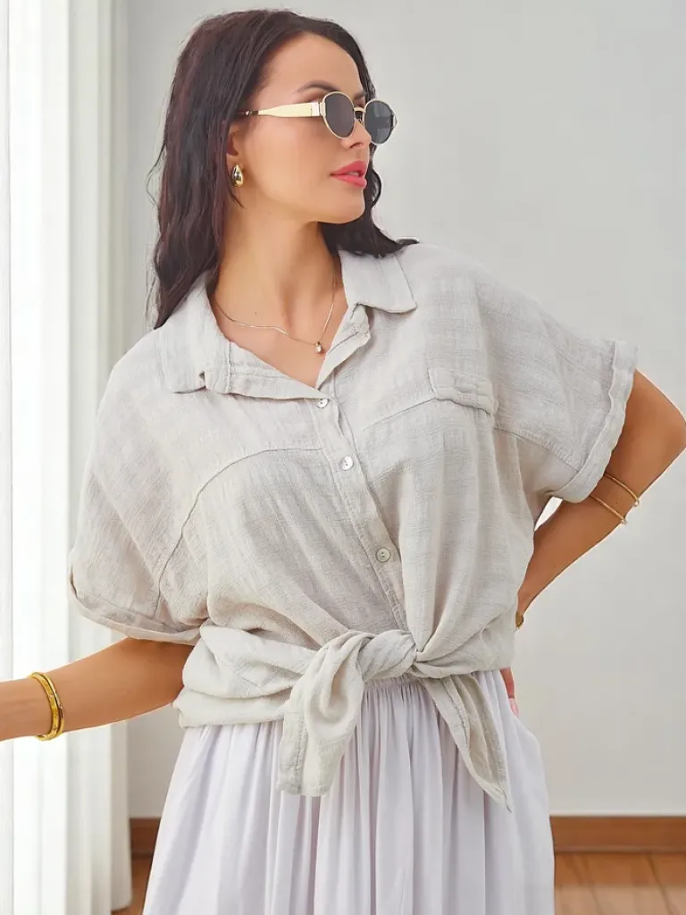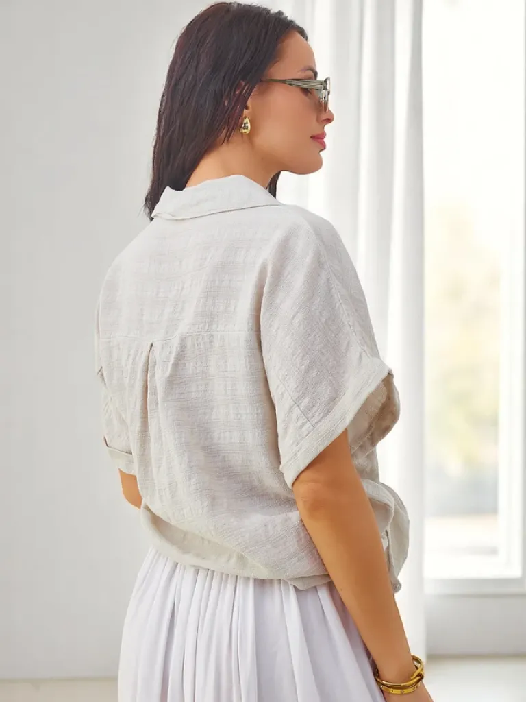 - Bawełniana koszula damska z tłoczeniem z krótkimi rękawami. Model z dekoltem w serek, jest zapinany na guziki. Must have w szafie każdej kobiety!