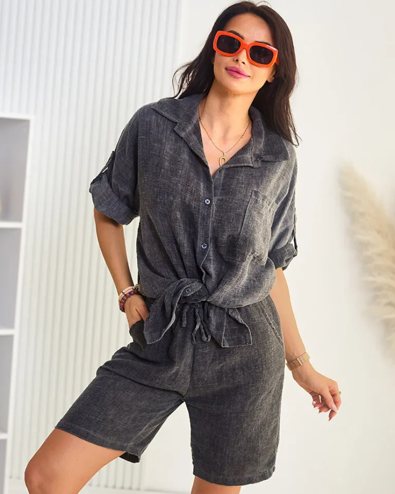 - Damski koszulowy komplet wykonany z przyjemnego materiału. Bluzka z rękawami 3/4 oraz krótkie spodenki z gumą w pasie. Poczuj lato w tym wspaniałym komplecie!