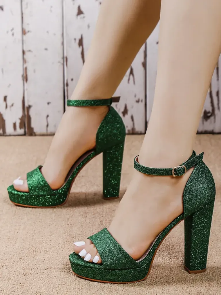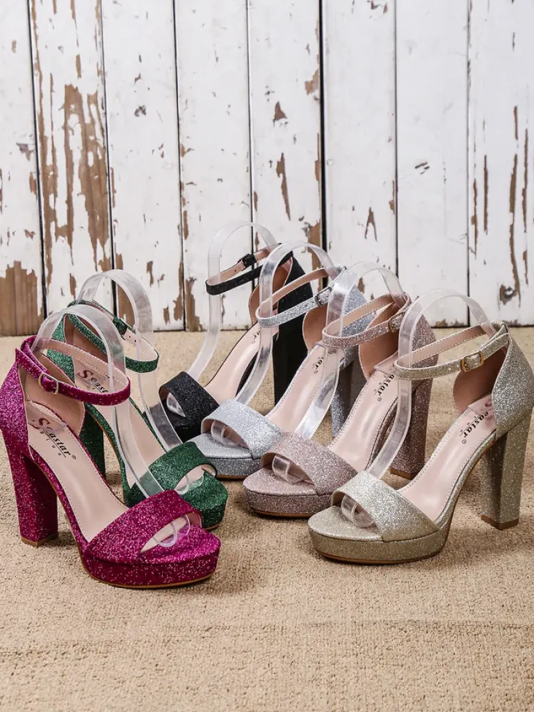 - Damskie sandałki na słupku – to idealny pomysł na gorące letnie dni. Model wykonany z tkaniny z brokatem i eko skórzanej wkładki. Obuwie zapinane na sprzączkę. Połączenie stylu i wygody!