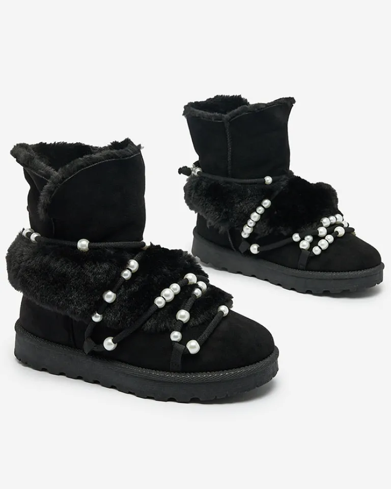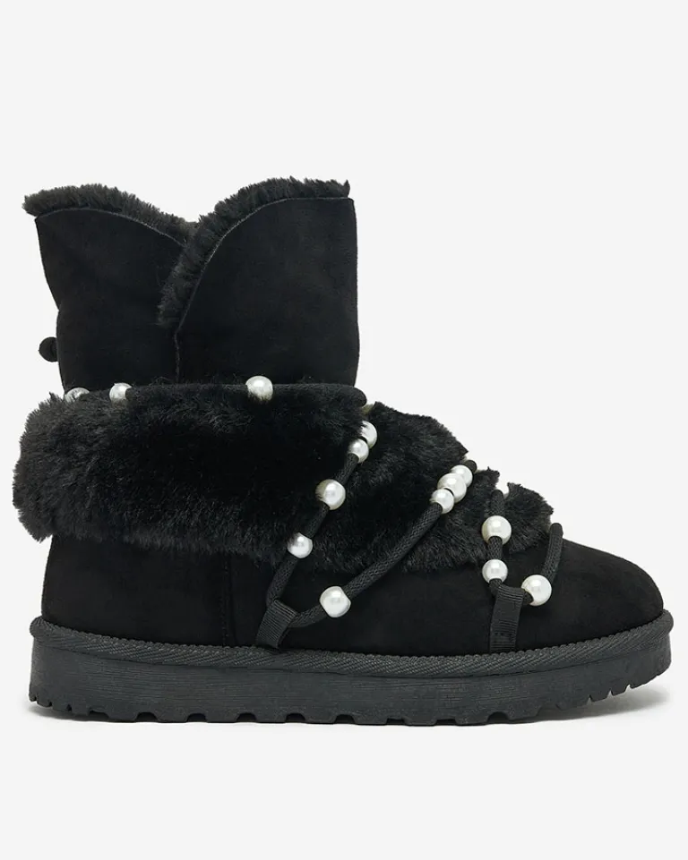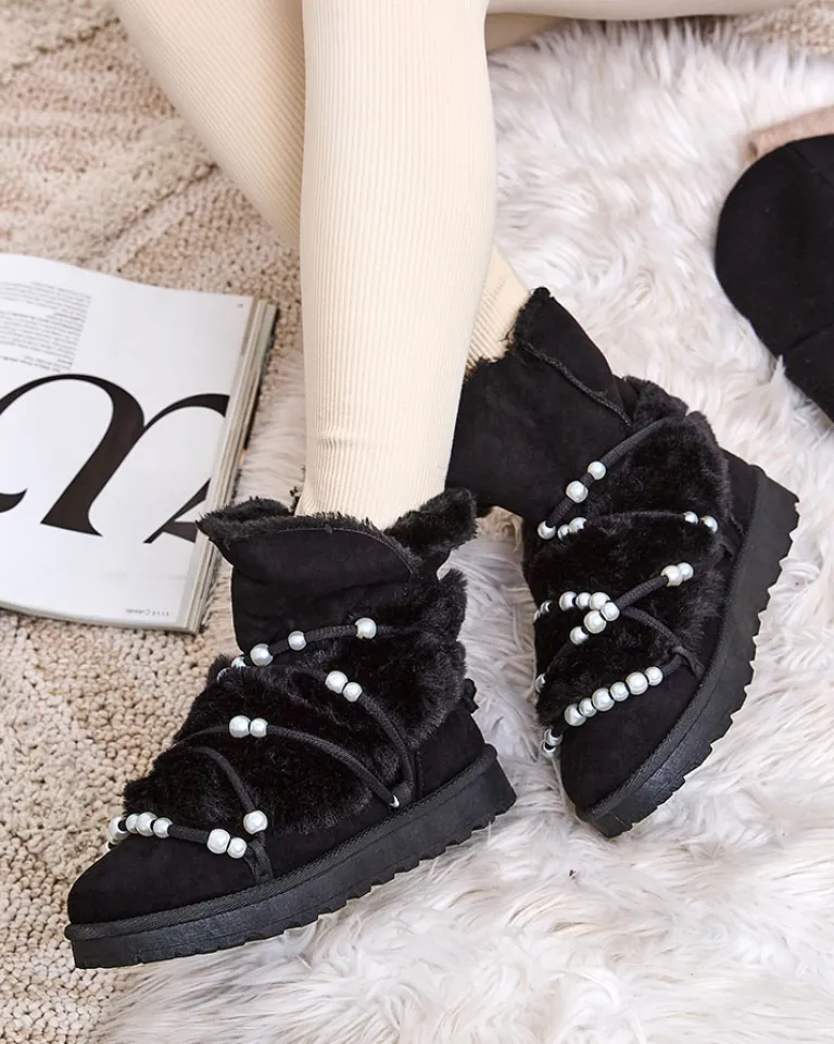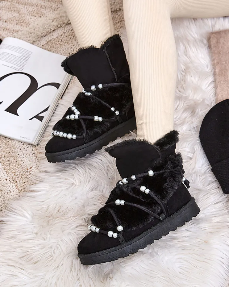 - Ocieplane damskie zimowe buty typu śniegowce na płaskim obcasie. Cholewka sznurowana, zdobiona perełkami, wykonana jest z połączenia eko-nubuku oraz futerka. Idealna baza na zimę!