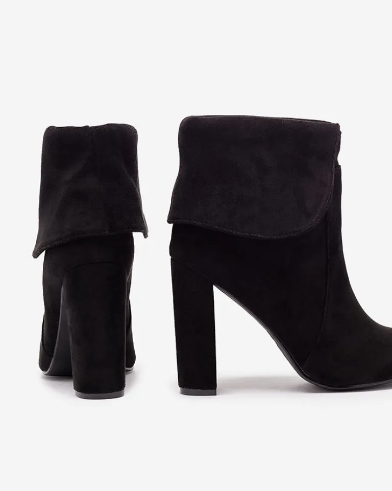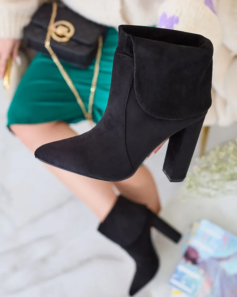 - Stylowe damskie eko-zamszowe botki to idealne rozwiązanie na chłodniejsze dni. Cholewka jest wsuwana, w środku eko-skórzana wkładka. Model na wyższym słupku i z noskiem w szpic. Super dodatek do Twoich casualowych outfitów!