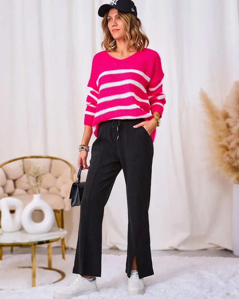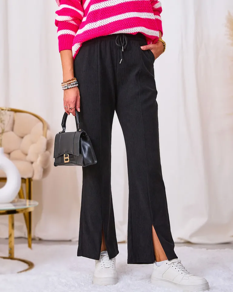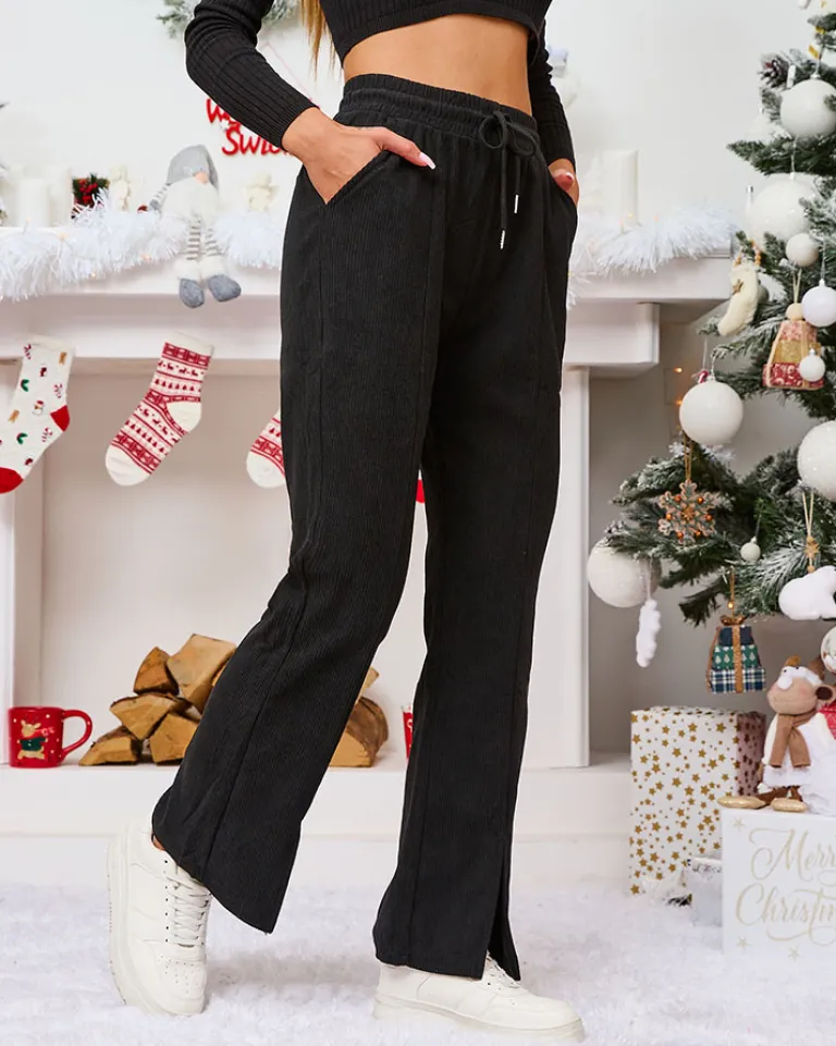 - Rewelacyjne szerokie spodnie damskie z materiału typu sztruks. Model posiada elastyczną gumę w pasie z regulowanymi troczkami. Dodatkowo, dwie wsuwane kieszenie z przodu. Hit tego sezonu!