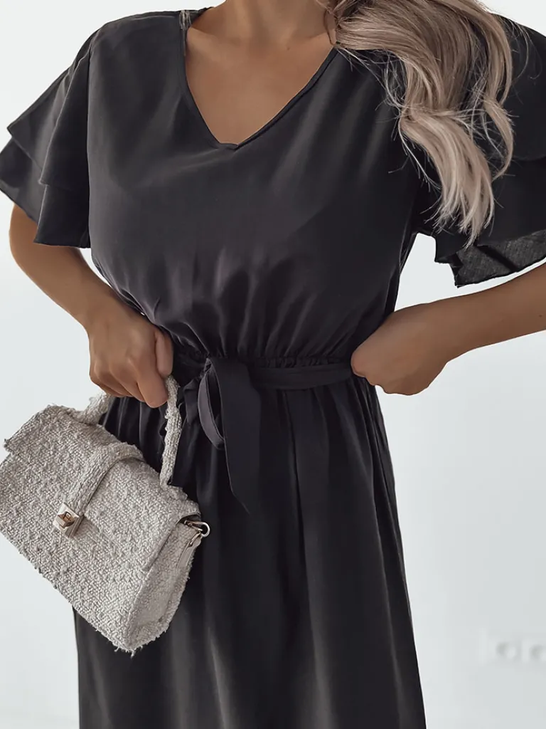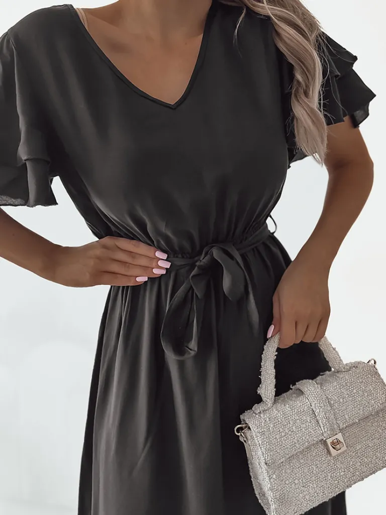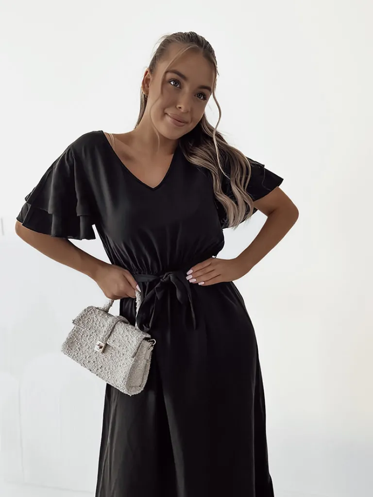 - Stylowa damska sukienka wykonana z lekkiej tkaniny. Produkt o długości midi, posiada krótkie rękawy. Dodatkowo pasek w zestawie. Poczuj lato w tym modelu!