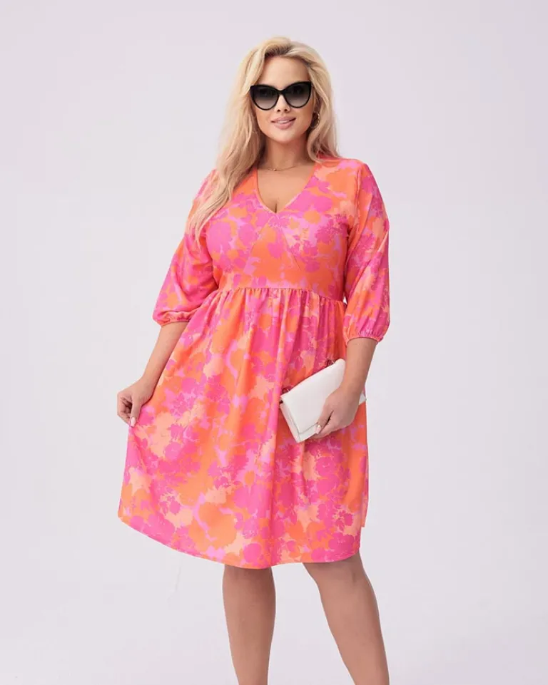 - Sukienka damska do kolana z printem, z rękawami 3/4 i dekoltem w serek. Dodatkowo gumka w talii. Must have tego sezonu! UWAGA: Dokładność pomiaru (+/-) 1 cm. Wymiary mierzone na płasko.