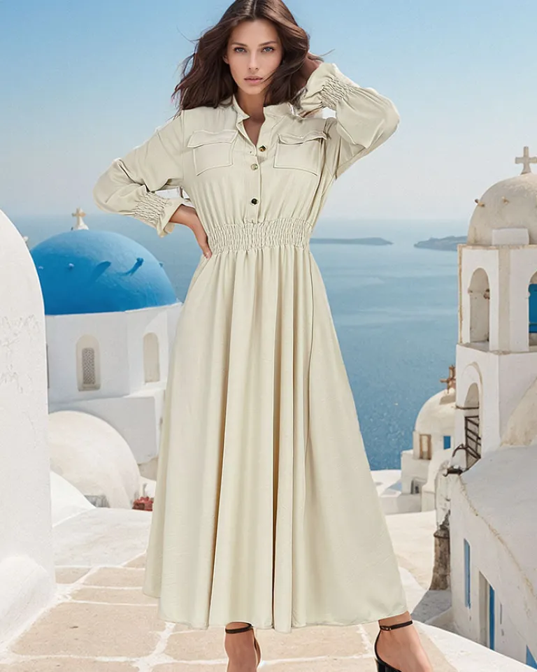 - Stylowa damska sukienka wykonana z lekkiej tkaniny. Produkt o długości midi, posiada długie rękawy. Gumka w pasie podkreśla talię, a kołnierzyk i guziki dodają uroku. Poczuj lato w tym modelu!