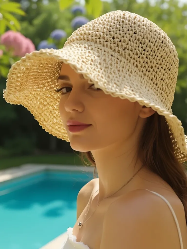 - Słomiany kapelusz damski z szerokim rondem. Lekki, przewiewny i elegancki — idealny na słoneczne dni, letnie spacery i stylowe chwile na plaży czy w ogrodzie.