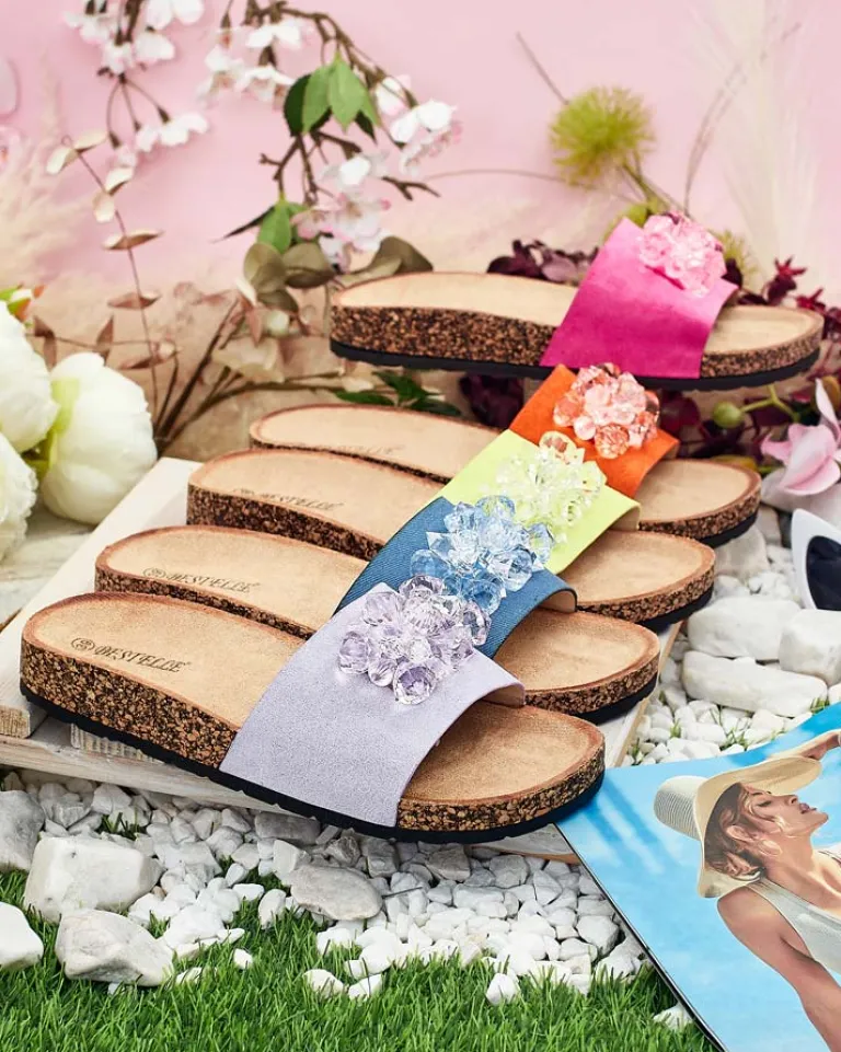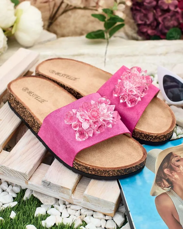 - Płaskie klapki z kryształkami na paseczku to wyjątkowe połączenie stylu i wygody. Cholewka i wkładka wykonane z eko-zamszu nadają im elegancki wygląd. Podeszwa ozdobiona tworzywem przypominającym korek – dodaje im oryginalności!