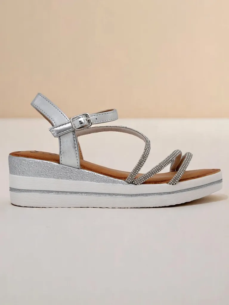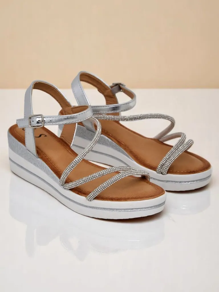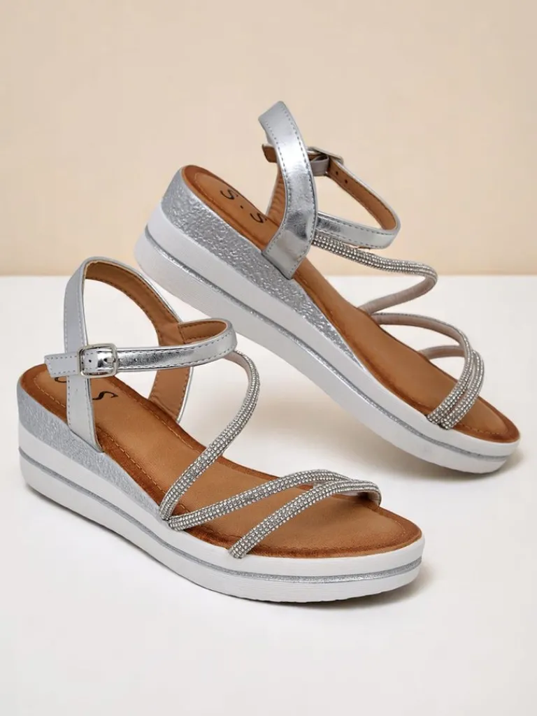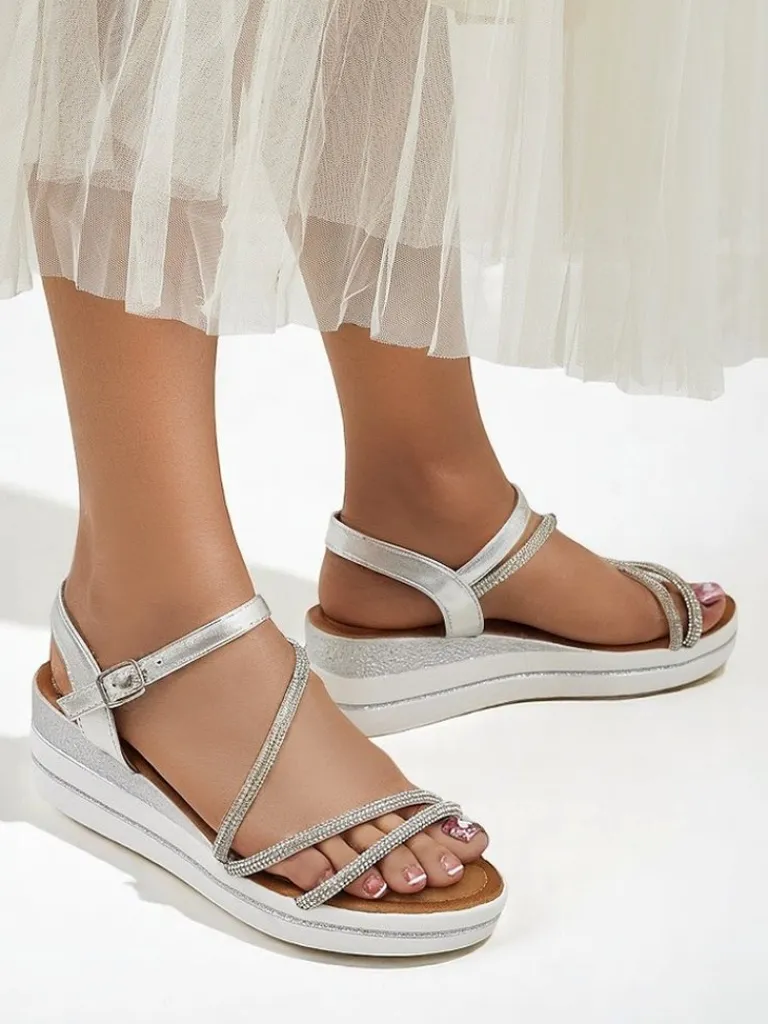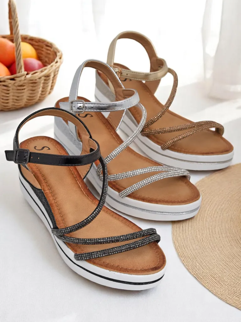 - Odkryj elegancję z tymi sandałami. Zjawiskowe na koturnie, ozdobione błyszczącymi cyrkoniami, idealnie podkreślają letni blask. Połączenie komfortu i luksusowego wyglądu – doskonałe na każdą wyjątkową okazję!
