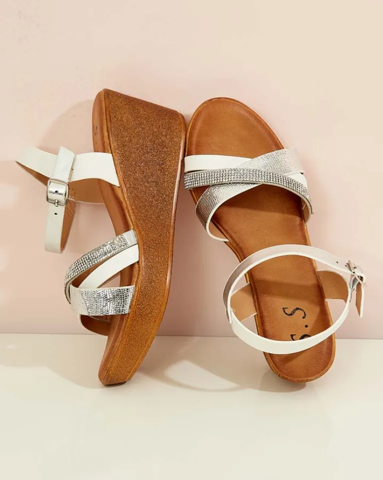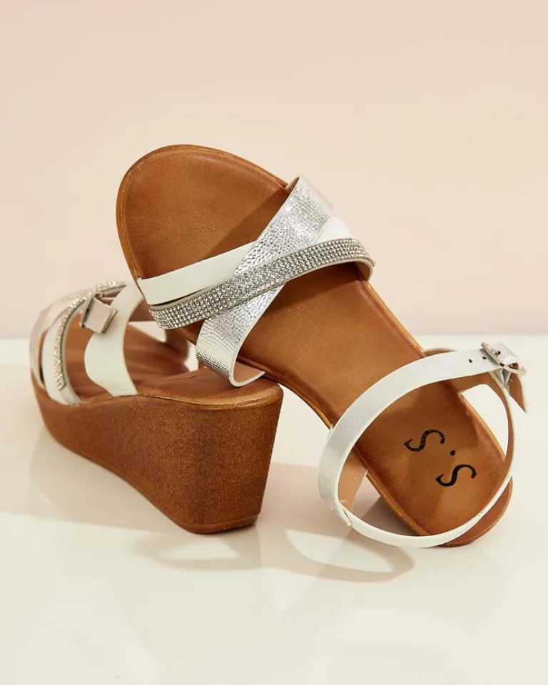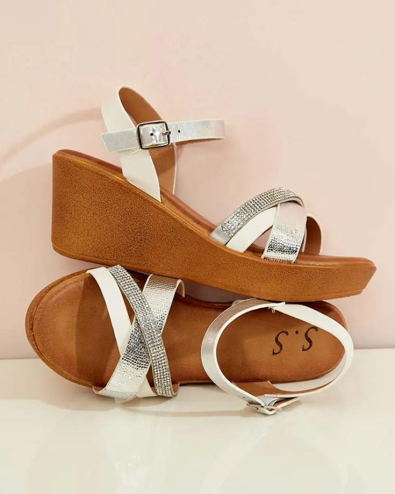 - Damskie sandałki na niskim koturnie- to idealny pomysł na gorące letnie dni. Model całościowo wykonany ze skóry ekologicznej. Cholewka udekorowana ozdobnymi cyrkoniami. Załóż je do krótkich spodenek!